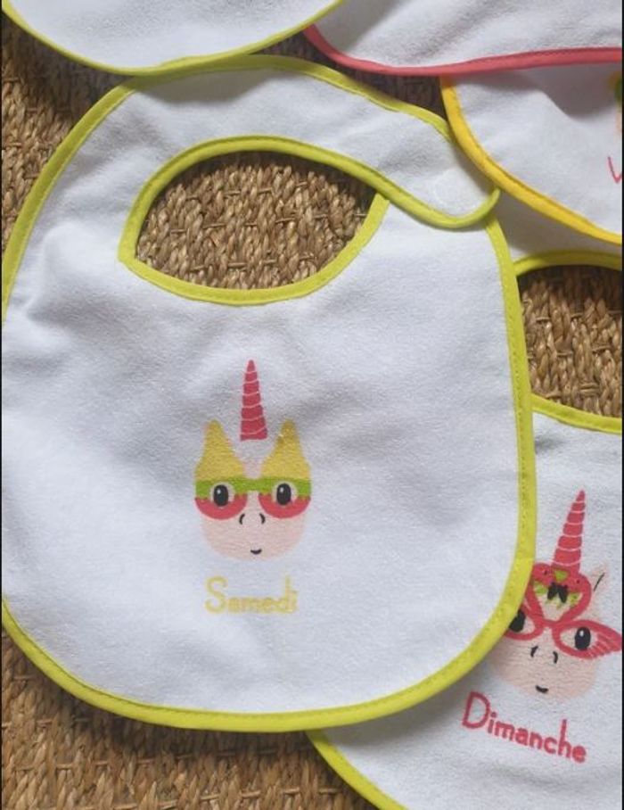 Lot de 5 bavoirs neuf. Dessus éponge et arrière plastifié. Ouverture scratch. Visuel licorne avec 5 jours de la semaine. Marque : Orchestra Premaman Envoi rapide dans colis protégé. N'hésitez pas à visiter mon dressing pour d'autres articles bébé et faire des lots pour profiter des remises et des frais de port reduit.