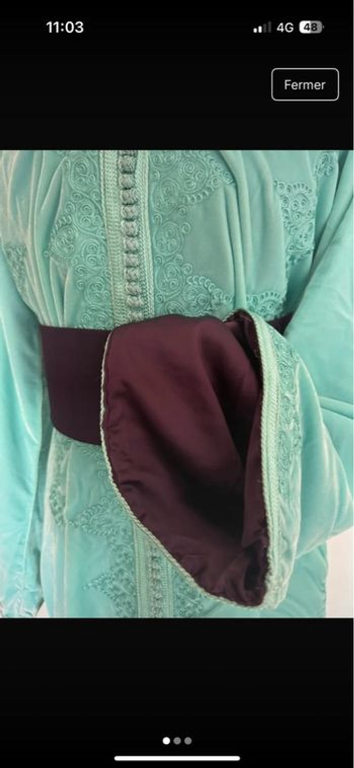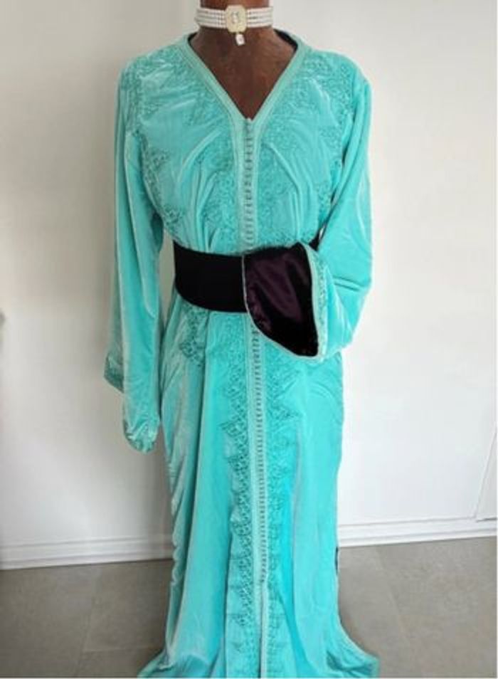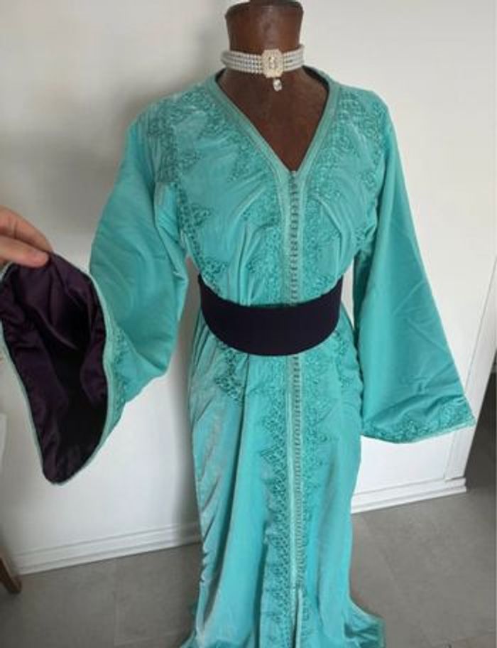 Caftan bleu cyan velours, intérieur soie violet