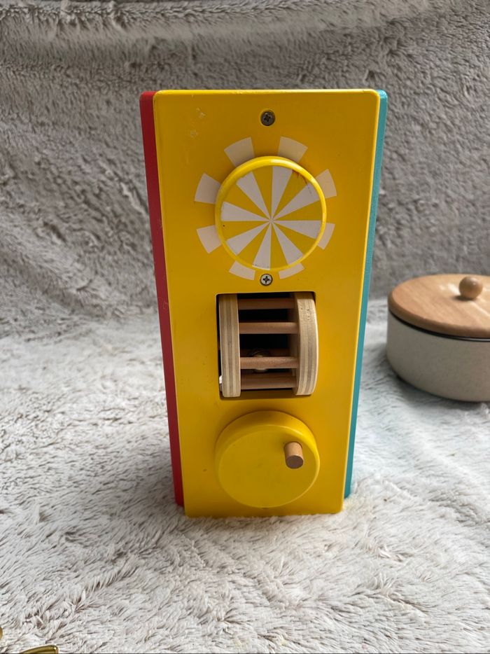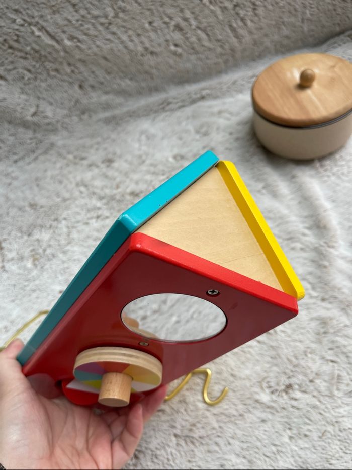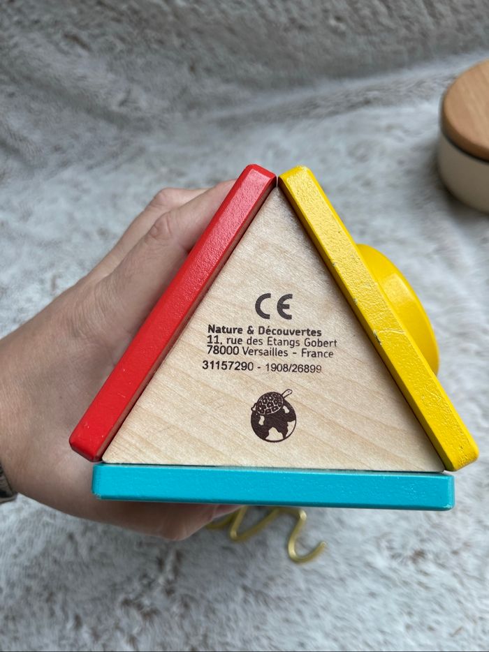 Triangle sensoriel multi activités en bois rouge, bleu et jaune.