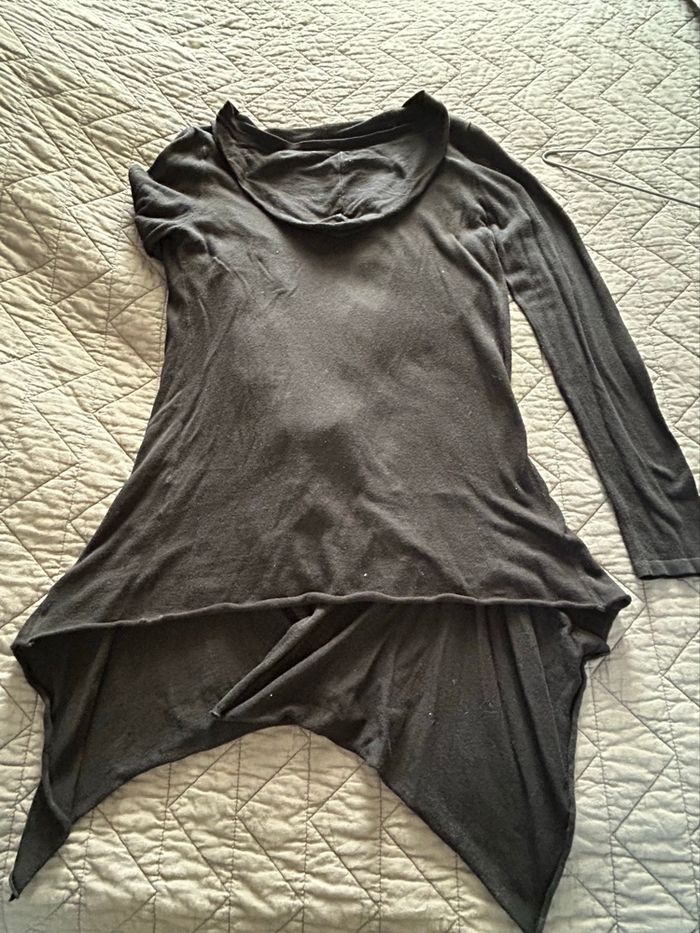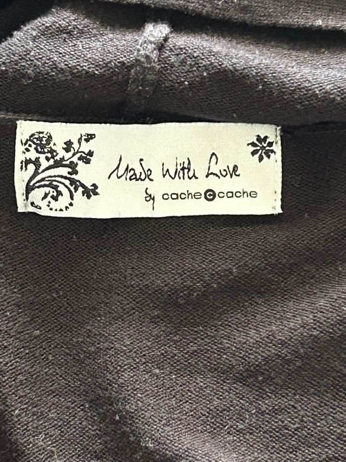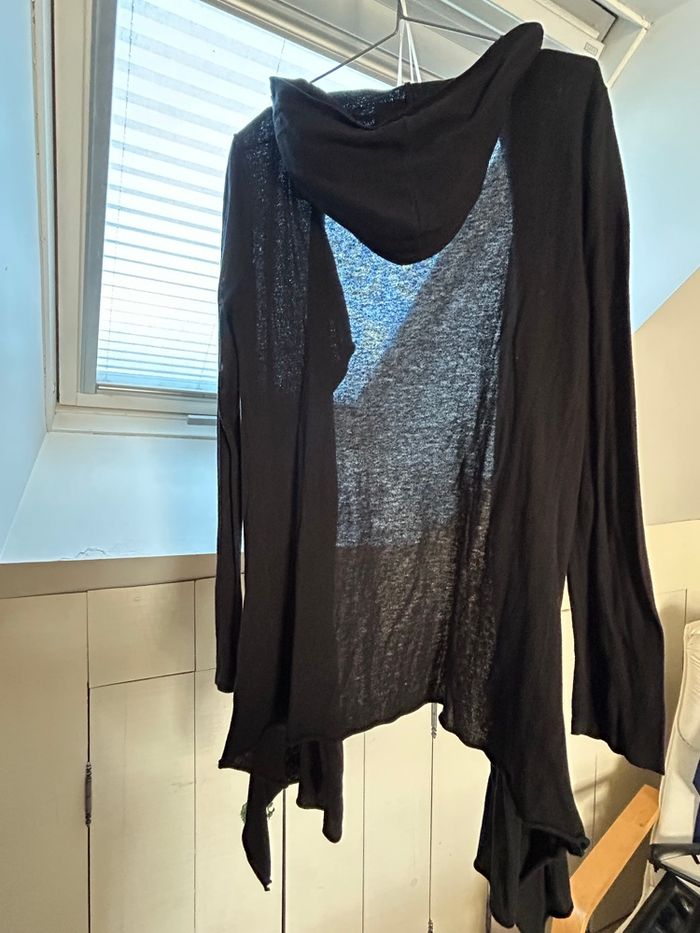 long gilet cardigan noir de la marque « Cache Cache ». Taille 2 Une capuche pour le style décontracté, Le devant est composé d’empiècements asymétriques. Matière assez fine. Peut se porter sous un manteau d’hiver. En très bon état.