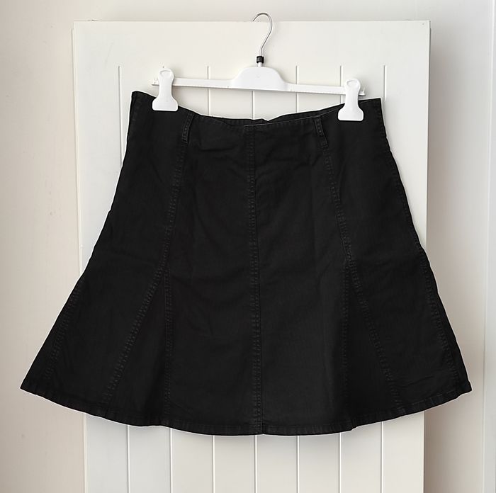 "Jupe évasée pour femme, indiquée taille 44 mais taille petit, convient mieux à un 42. Matière en coton épais type jean, confortable et structurée. Dimensions : Largeur taille à plat : 44 cm Longueur totale : 55 cm Passants pour ceinture Coloris : noir (couleur un peu passée) État : bon (couleur légèrement passée mais reste en bon état général) Parfaite pour un look casual avec des baskets ou plus habillé avec des bottines.