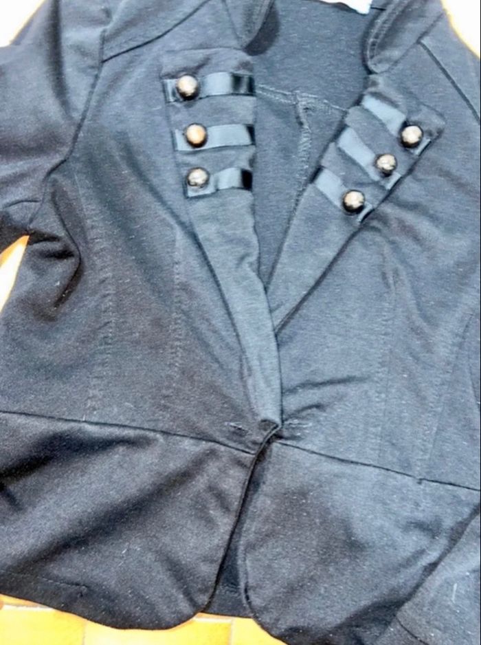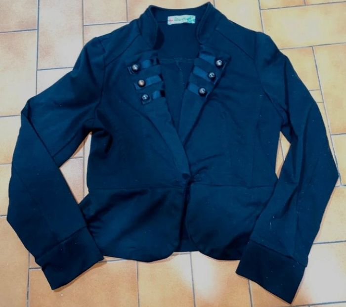 Veste sympa de couleur noir avec boutons sur le col qui donne un style bon état
