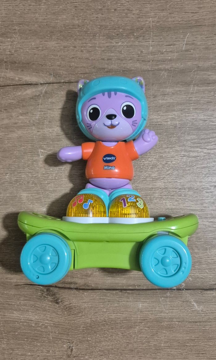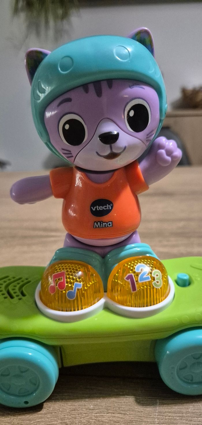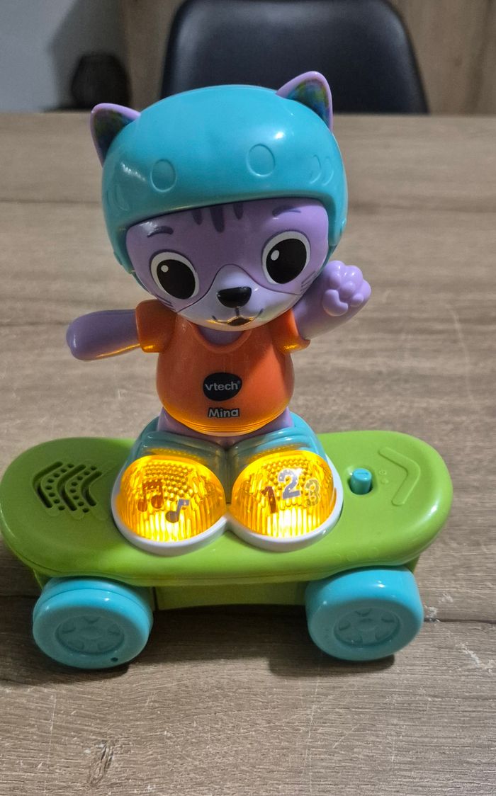 Jouet interactif, sonore et lumineux Mina mon chat rouli'golo Lorsqu'on lui donne de l'élan, se propulse sur son skate Chaussures lumineuses qui permettent d'apprendre les chiffres et la msuique Vtech Parfait état