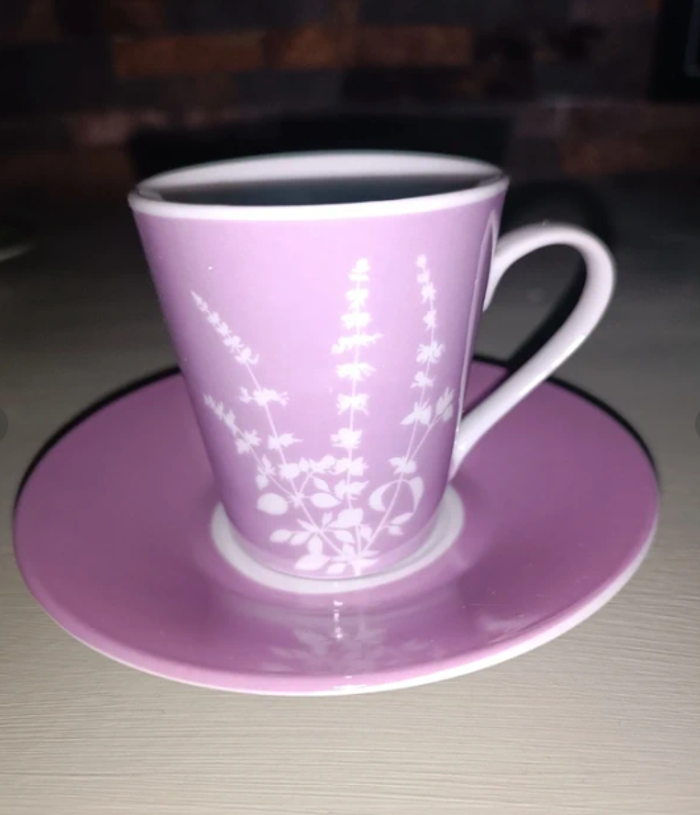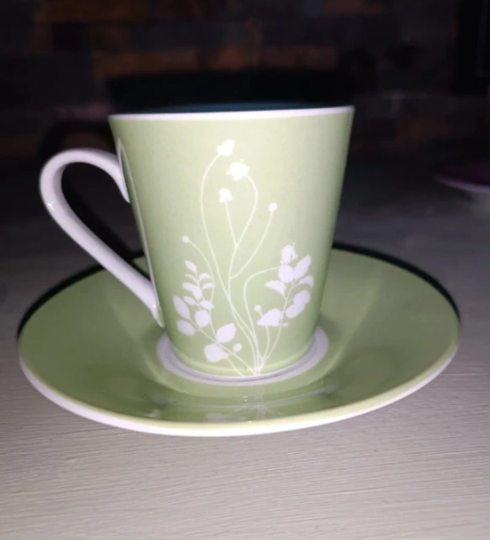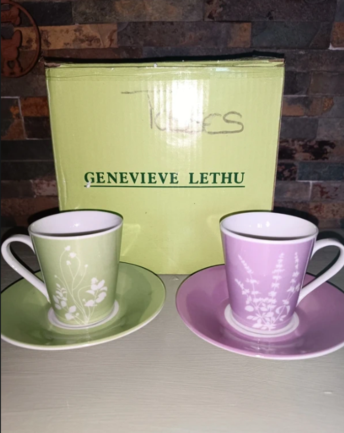 Lot de 4 tasses Geneviève Lethu Neuve jamais utilisé. Encore dans leur carton avec protection sorti juste pour la photo. 2 verte et 2 lilas avec leur sous tasses Marque : Genevieve Lethu