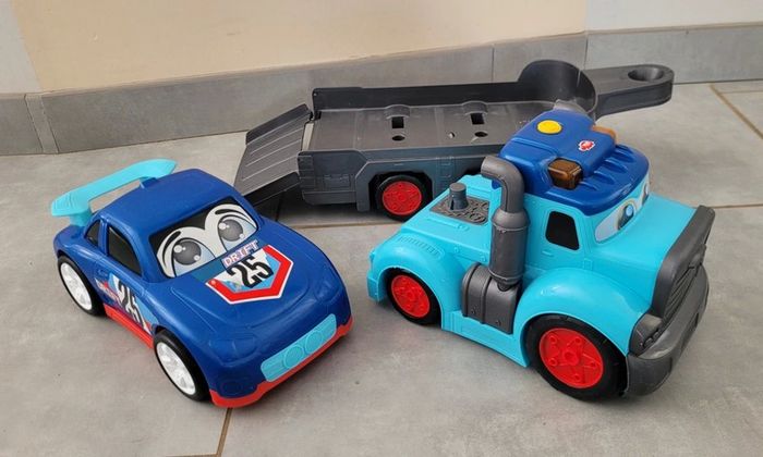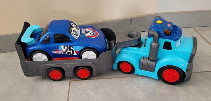 Camion bleu avec alarme sur le dessus, avec remorque détachable et voiture, de la marque Dickie Toys. Avec quelques traces d'usures, sinon en très bon état. Fonctionne parfaitement. Piles fournies