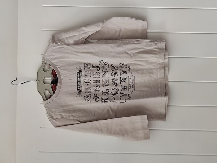 T-shirt pour bébé garçon, indiqué 3 ans mais taille plutôt petite, convient mieux à un 24 mois. Motif : texte Coloris : beige et noir Manches longues, parfait pour l’automne/hiver État : très bon Confortable et facile à associer avec un pantalon ou un jean.