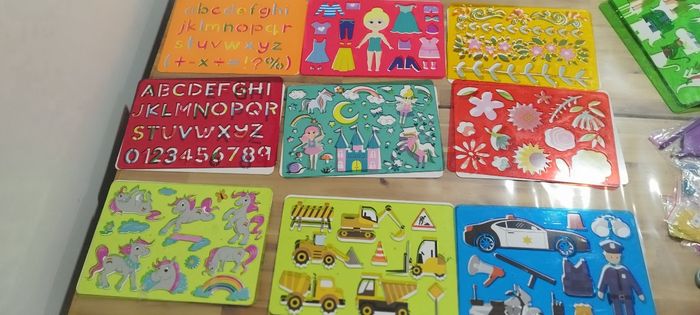 Lot de 18 planches de pochoirs pour enfants : Alphabet Véhicules Licornes Police .... Quelques modèles ont été coloriés mais dans l'ensemble en très bon état