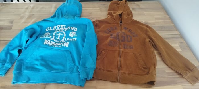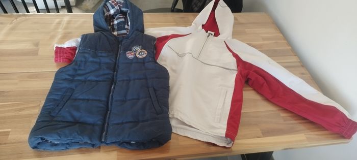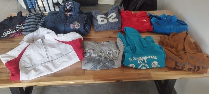 Lot de vêtements garçon 10 ans : Des sous-pulls, sweats, gilets, coupe-vent, manteau sans manches, pyjama pilou, peignoir.
