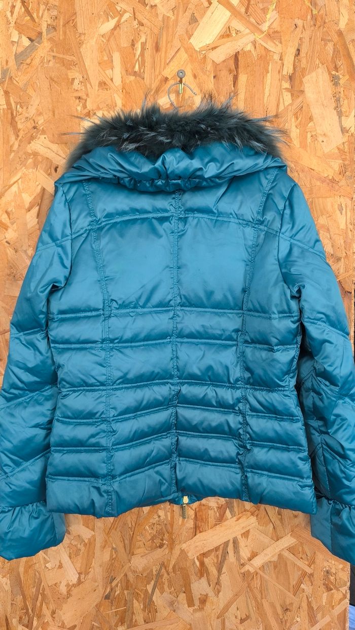Fourrure Amovible : Col montant avec Véritable fourrure de raton laveur (Lotor/Raccoon Fur), AMOVIBLE par zip. La fourrure est bleu canard assorti à la veste, avec quelques reflets gris.