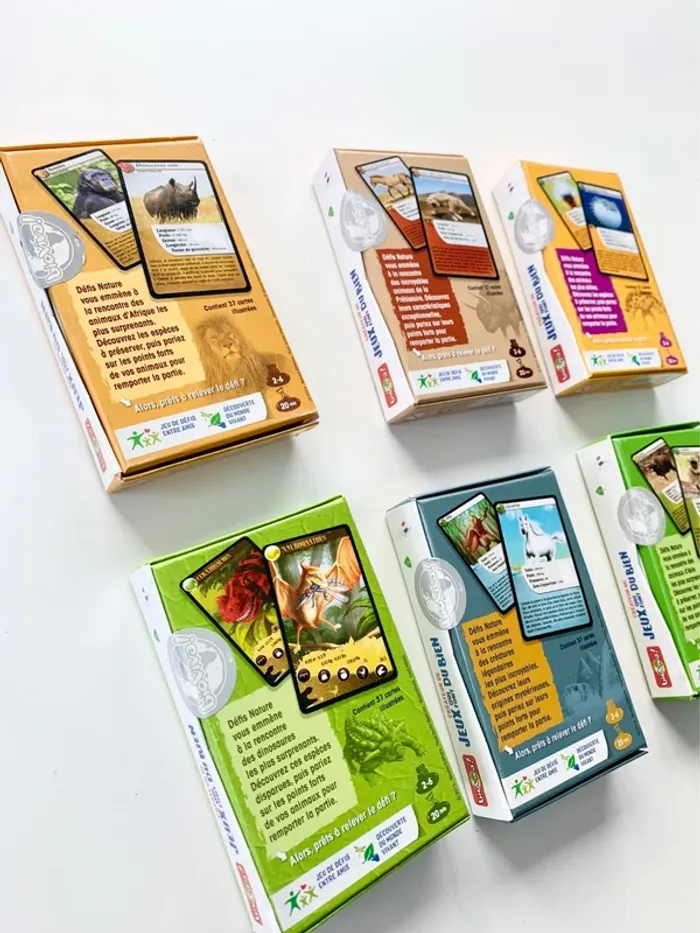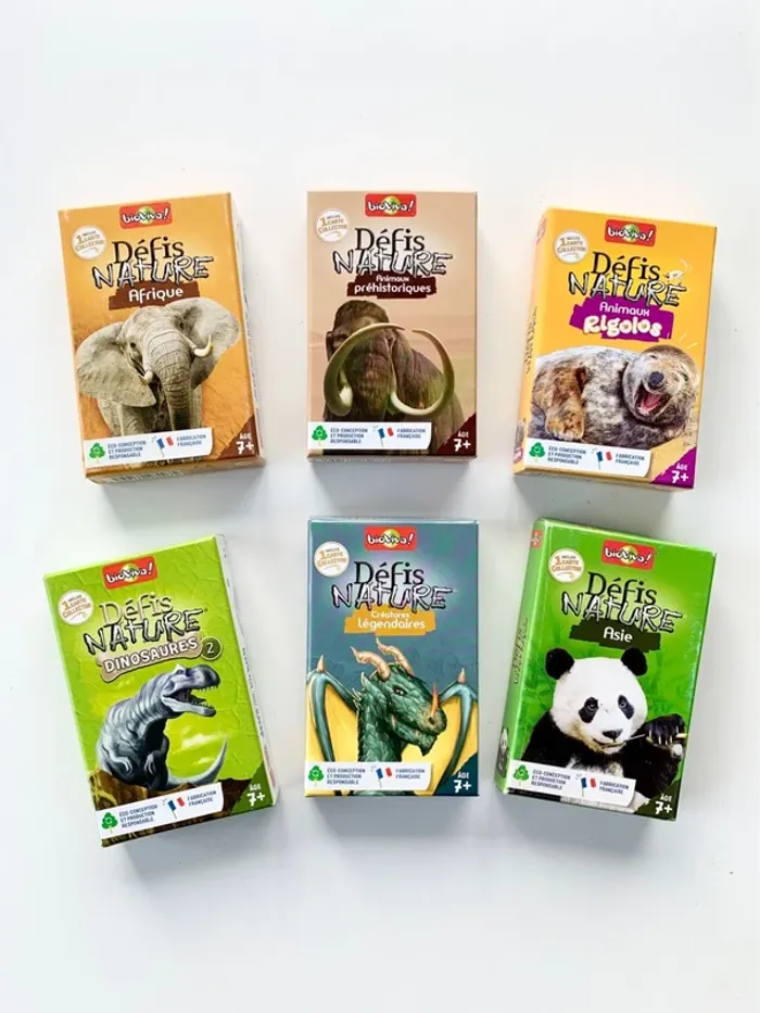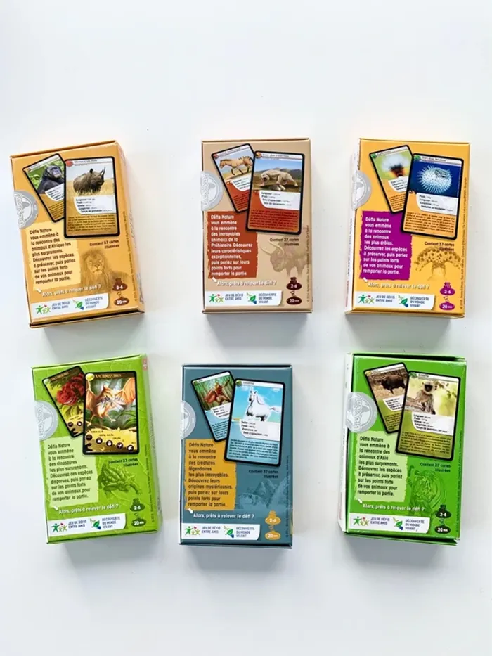 « Défis Nature » est devenu un véritable phénomène de cour de récréation grâce à des règles très simples et amusantes : les joueurs tirent chacun une carte de leur tas respectif et parient sur une des caractéristiques listées sur cette carte. Celui qui possède la plus forte remporte les cartes des autres.