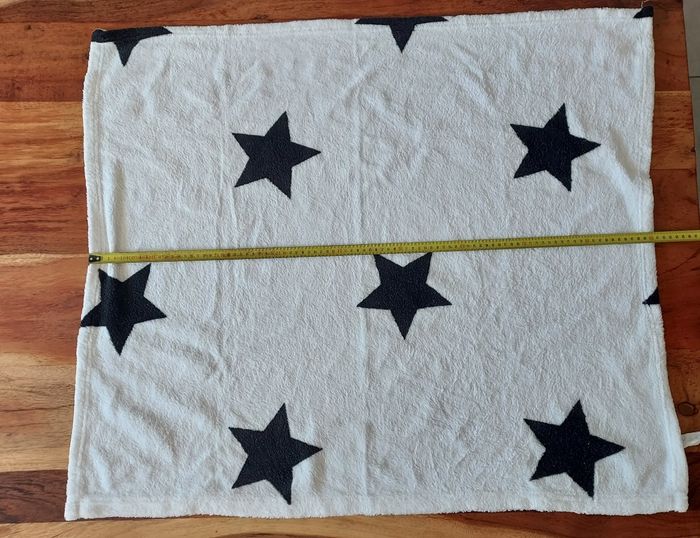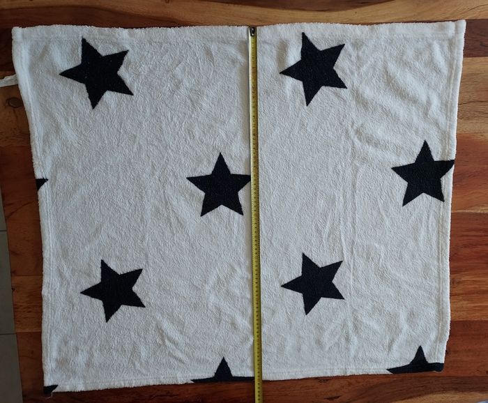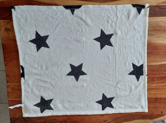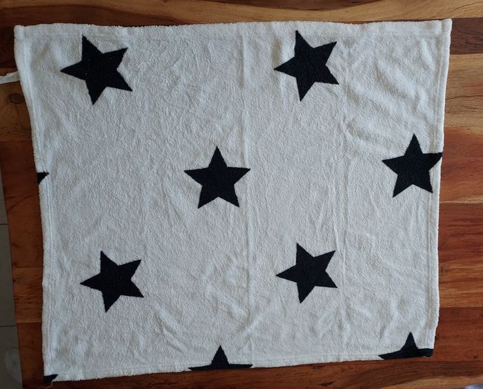 2 couvertures bébé: • Couverture bébé Kiabi avec motifs étoiles noires. 80cm x 90cm 100% polyester • Couverture bébé crème 83cmx68cm