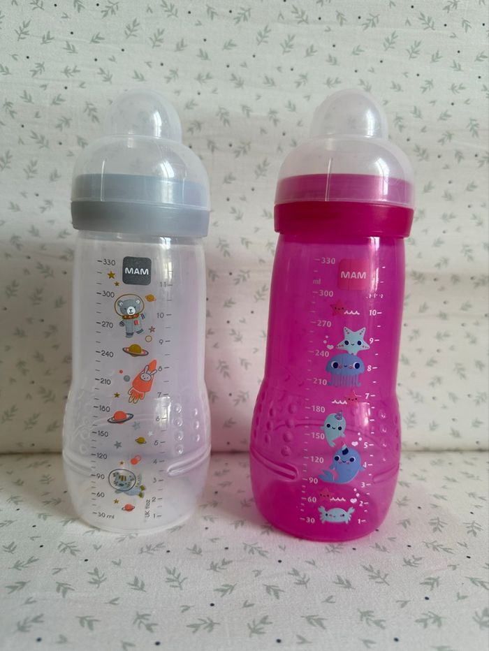 Vends 2 biberons Mam sans tétine. EASY ACTIVE - Biberons 2ème Âge - 6 Mois et Plus - 330ml Très bon état, peu utilisé 1 rose et 1 gris