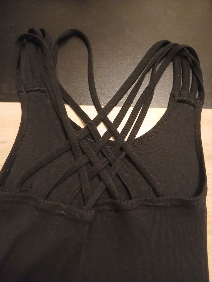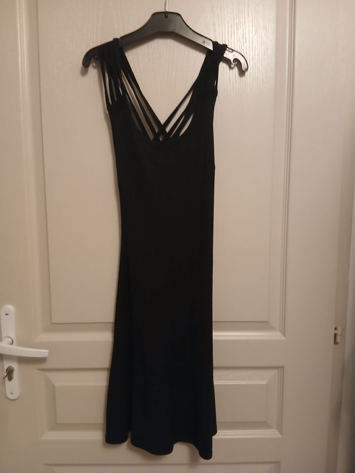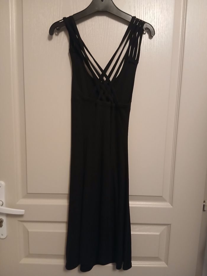 Robe noire croisée mi dos, en viscose et acrylique. 32 cm de largeur des aisselles 80 cm de longueur