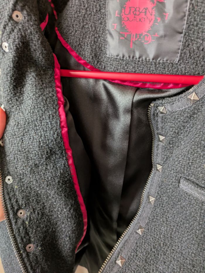Veste entièrement doublée satin noir avec bordure satinée rose.