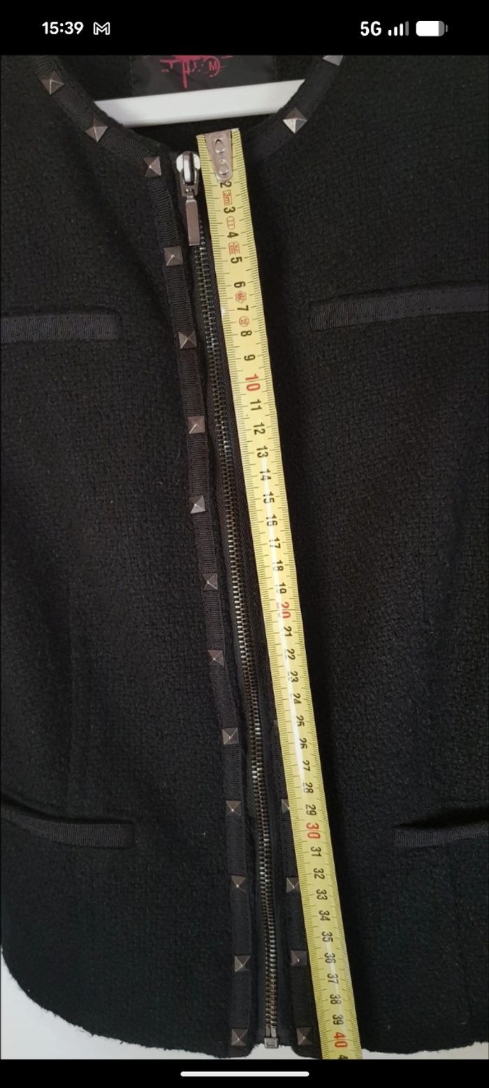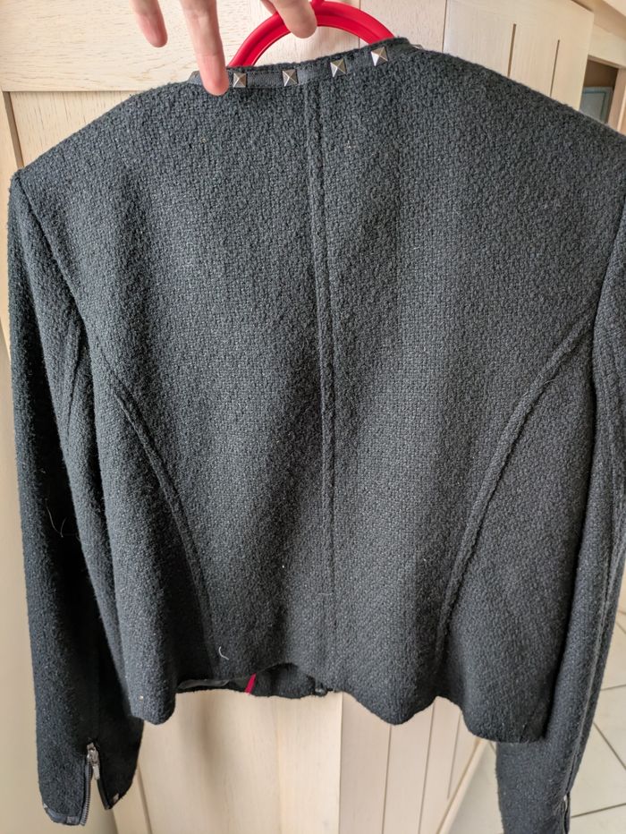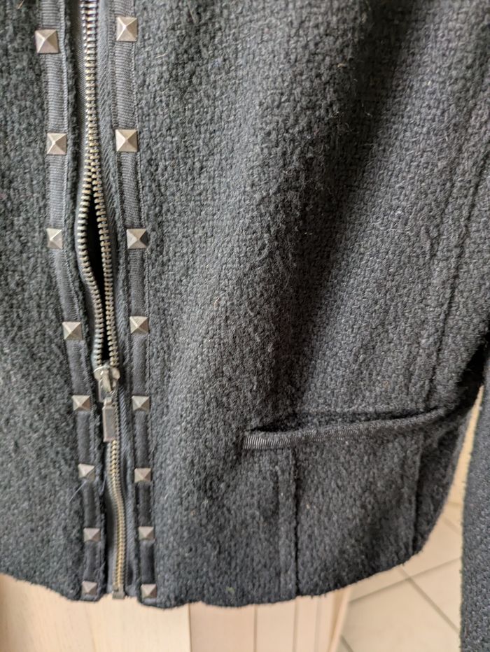 Petits décors métal en forme de pyramide le long de l'encolure, de la fermeture centrale et au bout des manches.