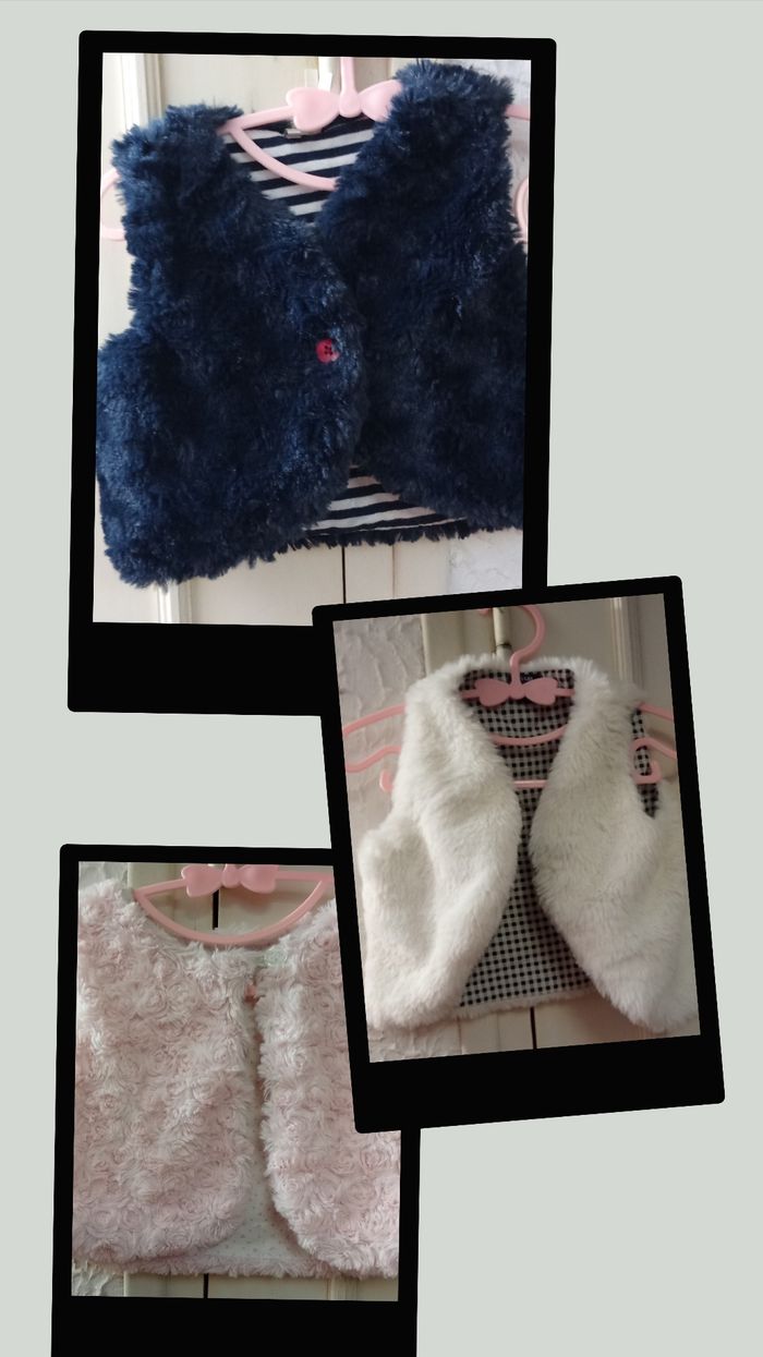 3 gilets doux sans manche . Mis très peu de fois sauf le blanc mais toujours en bon état . Je peux accepter de les séparer. Le lot est à 5€, à l'unité 2€ Possibilité de faire un prix de lot avec d'autres veste/manteau. Merci de me contacter