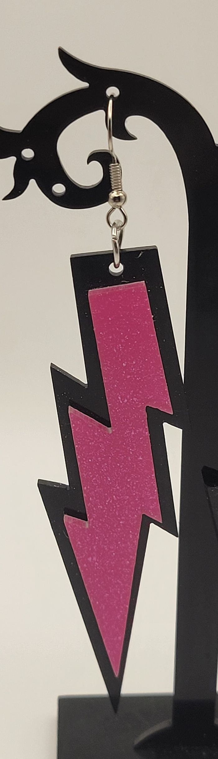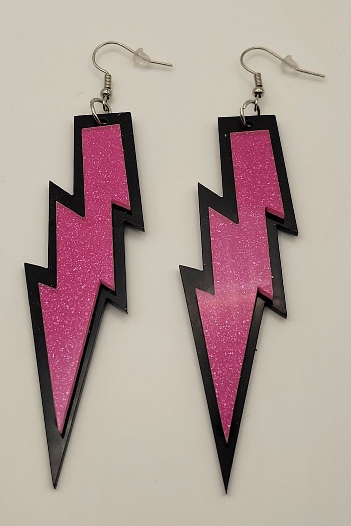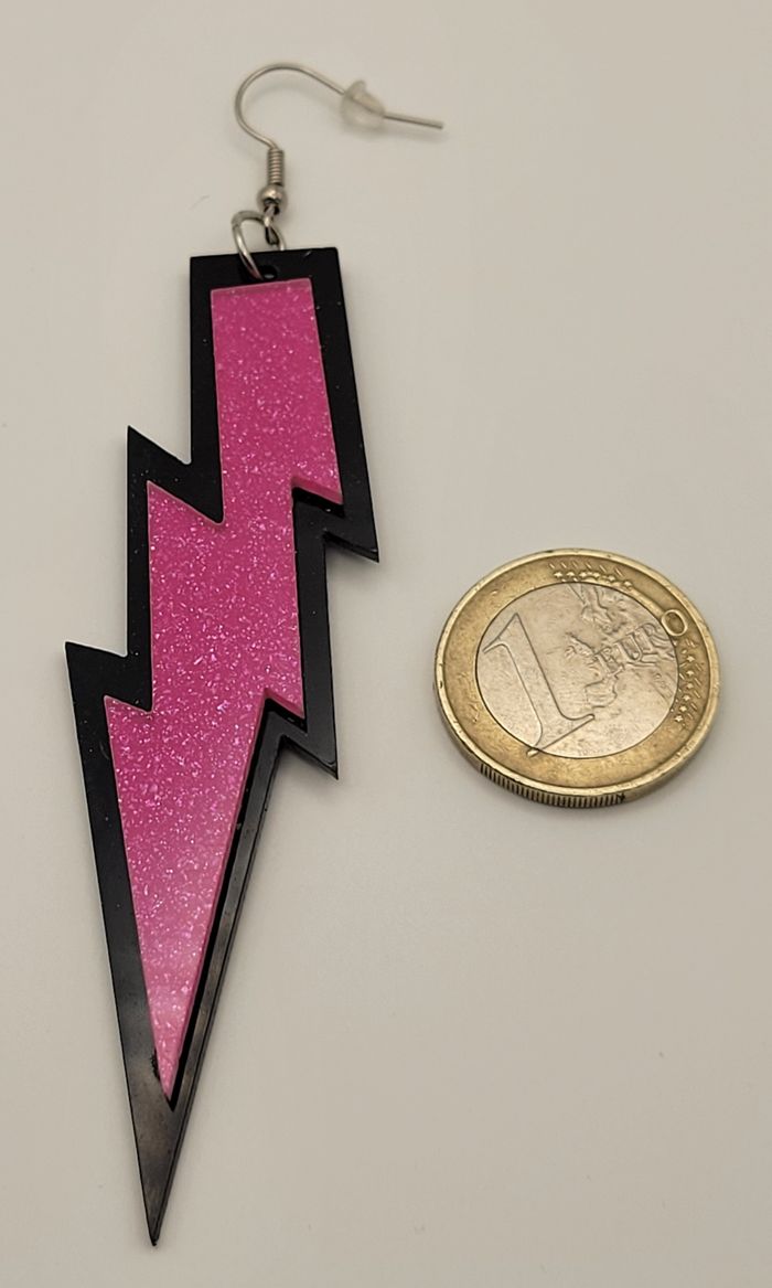BOUCLES D'OREILLES ECLAIR ROSE NOIR DISCO ANNEE 80 ! NEUF! Paire de boucles d'oreilles motif eclair rose pailleté et noir Hauteur : 11 cms. N'hésitez pas à regarder mes autres ventes. Envoi rapide et soigné.
