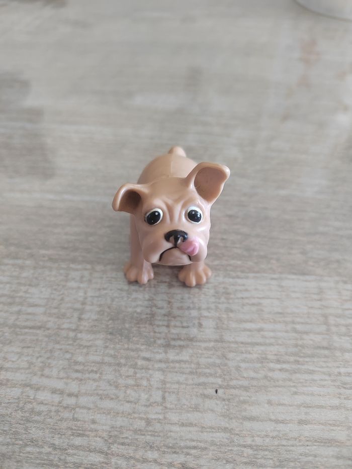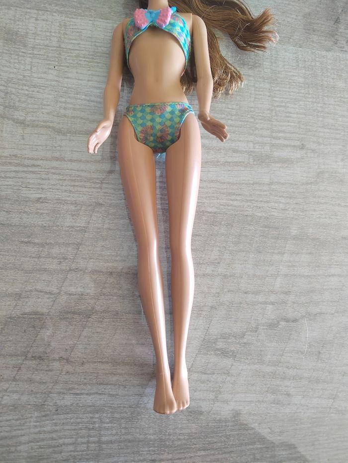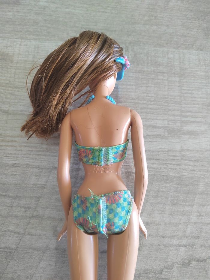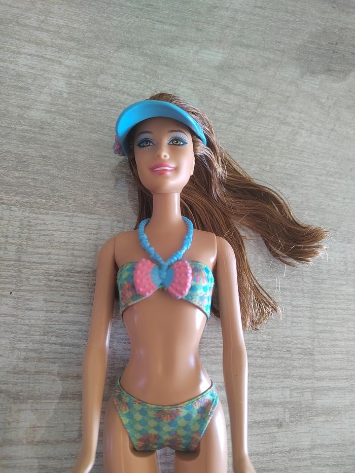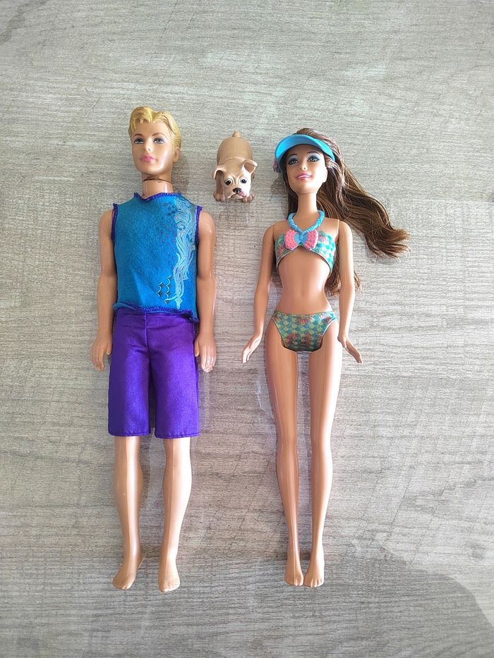 Lot composé d’une Barbie en maillot deux-pièces avec visière, d’un Ken en tenue de plage et d’un petit chien. Quelques défauts : traces d’usage, cheveux décoiffés, et tête recollée et mains abîmées sur le Ken (voir photo). Idéal pour custom, restauration ou jeu.