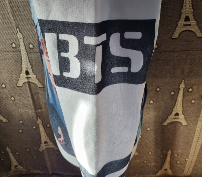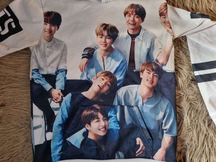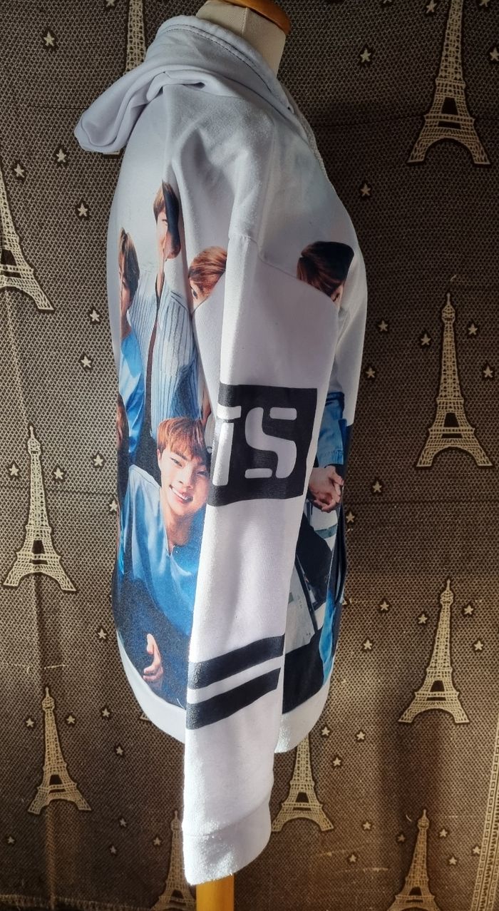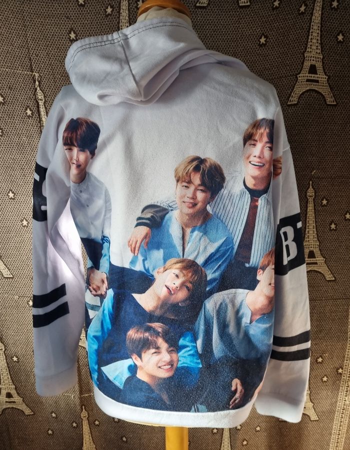 Sweat blanc à capuche imprimée Groupe BTS des 2 côtés,taille XL, poche ventrale, longueur 69cm, largeur 52cm, longueur épaule à aisselle 20cm ,largeur aisselle à aisselle 53cm, longueur manche 49cm, (quelques peluches sinon très bonne état)
