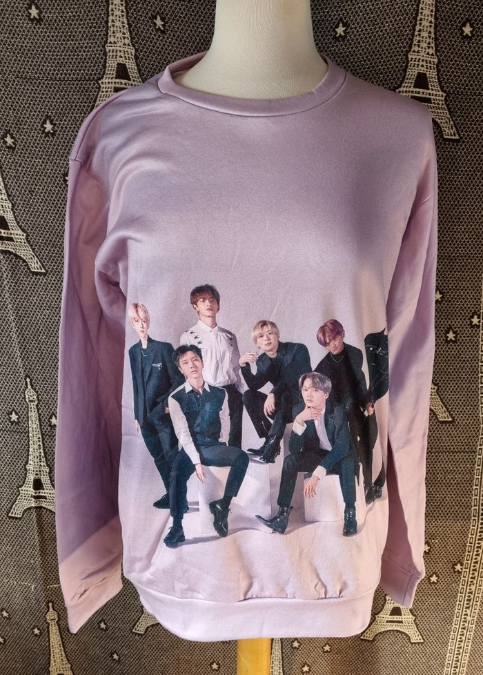 Sweat lila imprimé Groupe SuperM,taille XL,longueur 70cm, largeur 50cm, longueur épaule à aisselle 20cm, largeur aisselle à aisselle 54cm,longueur manche 54cm.