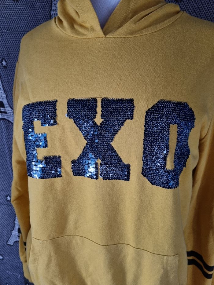 Sweat jaune à capuche groupe Kpop Exo (sequins réversible),taille XL, poche ventrale, longueur 63cm, largeur 51cm,longueur épaule à aisselle 18cm, largeur aisselle à aisselle 54cm,longueur manche 53cm.