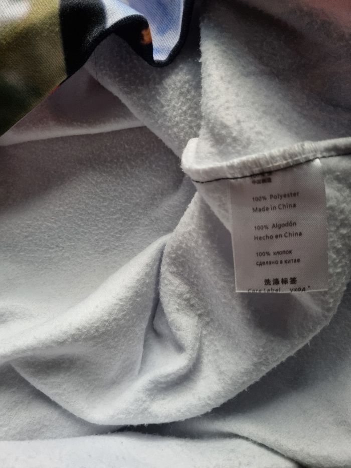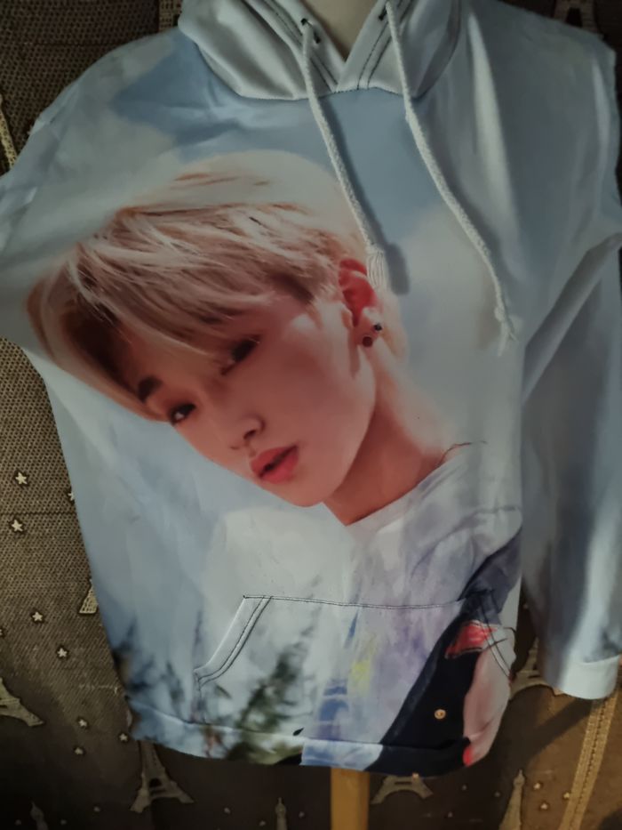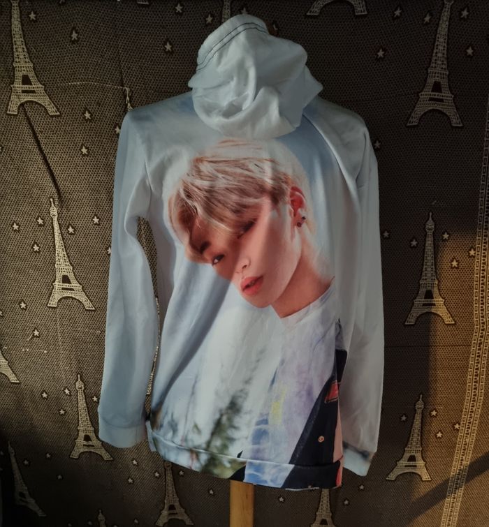 Sweat blanc à capuche imprimée San (Ateez) ,taille XL, poche ventrale, longueur 70cm, largeur 54cm, longueur épaule à aisselle 20cm, largeur aisselle à aisselle 55cm, longueur manche 54cm,(quelques peluches sinon très bonne état).