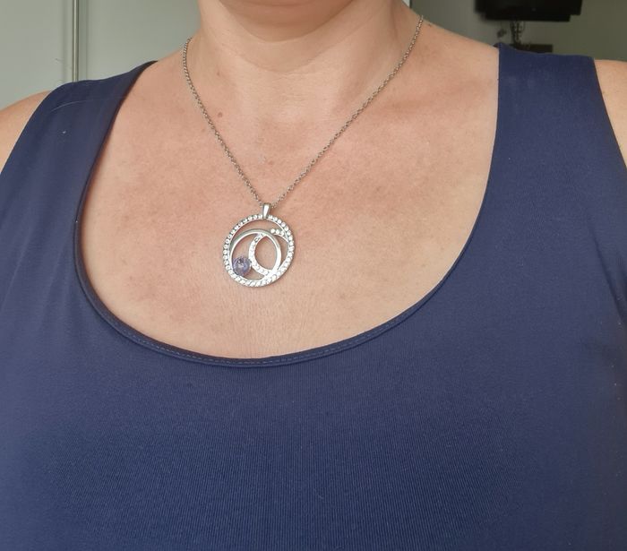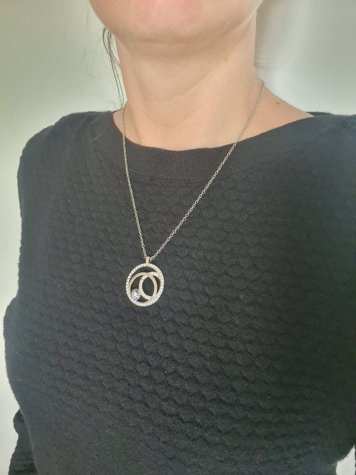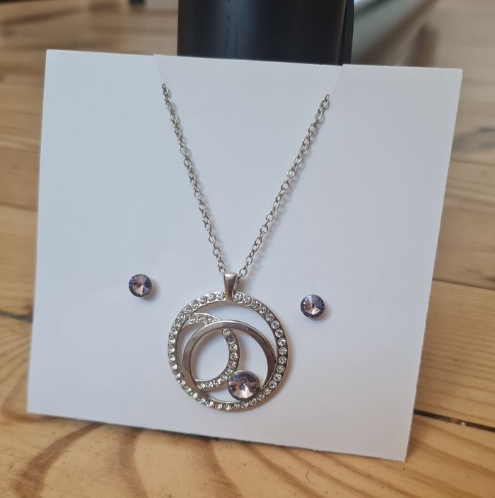 Ajoutez une touche raffinée à votre look avec cette parure délicate composée d’un collier argenté à pendentif cerclé et de boucles d’oreilles assorties ornées de pierres violettes.