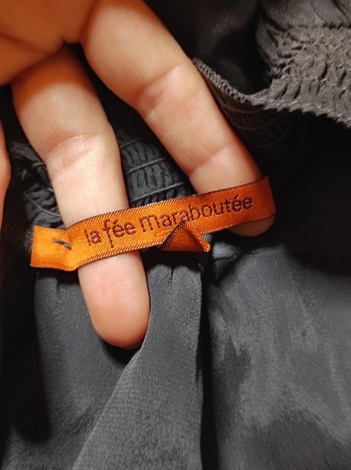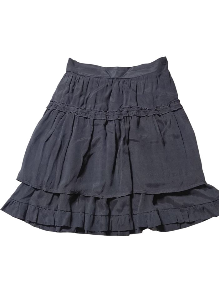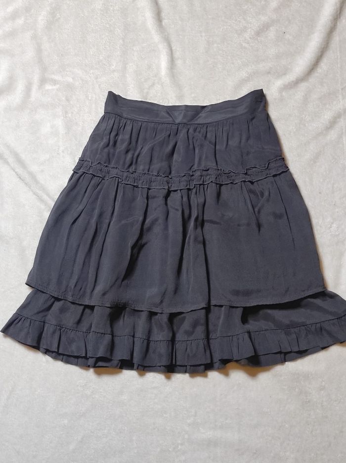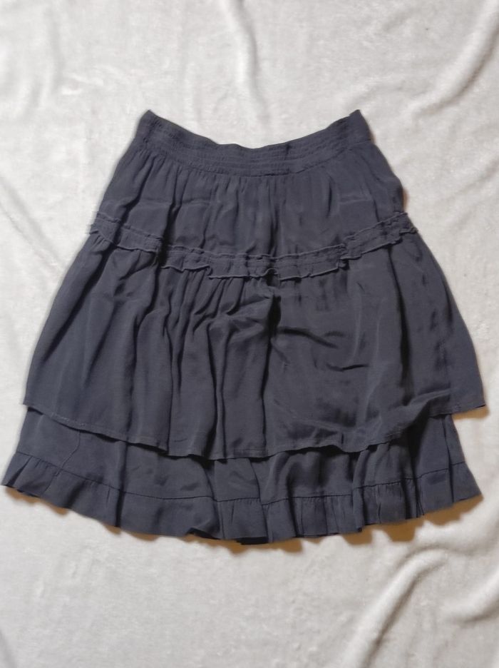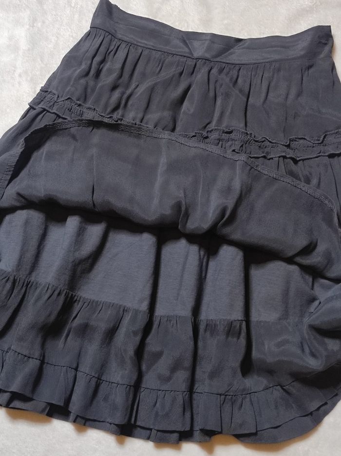 jolie jupe midi trapèze de couleur noire. Taille arrière élastique, légère et fluide. Mélange de 30% soie, 70% viscose et 100% coton. Marque la fée maraboutée en taille XS / 34. Pas de déchirures, trous ou tâches. Parfait état.