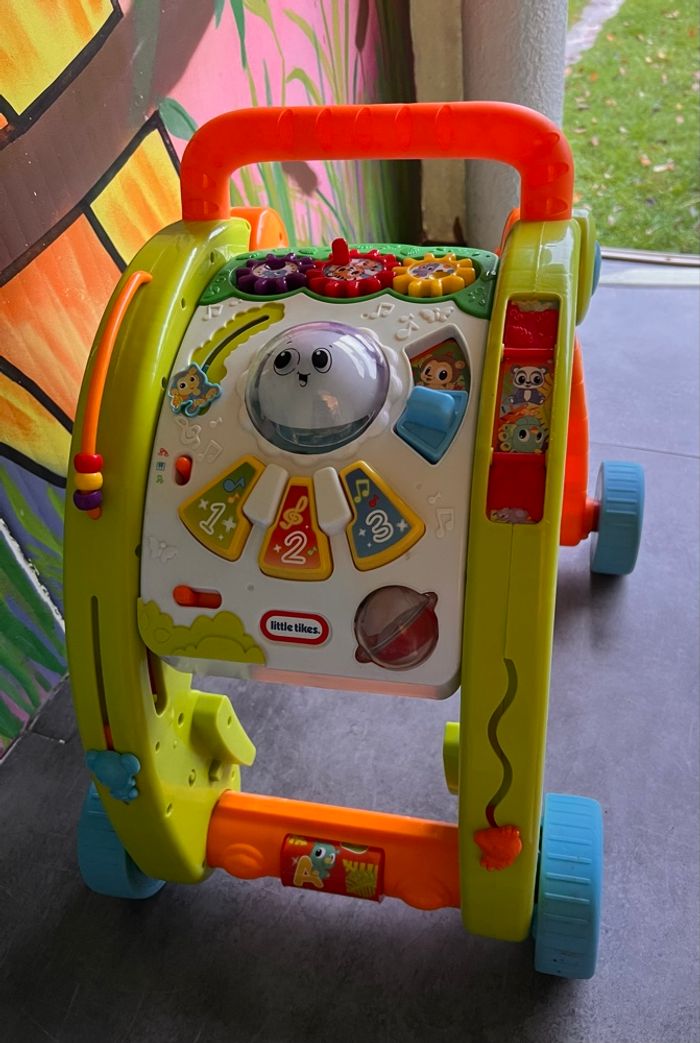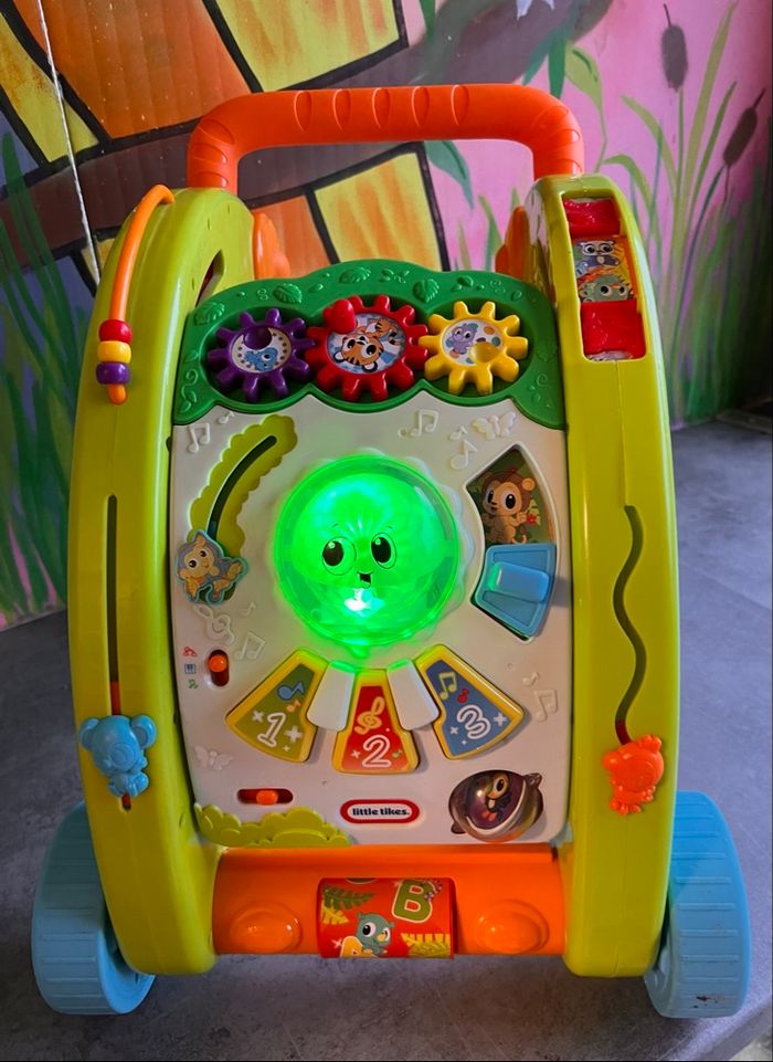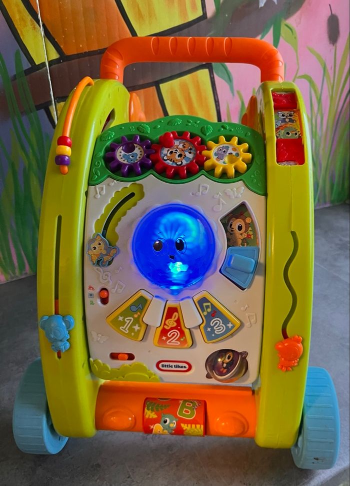 Le trotteur se transforme facilement en une table d'activités remplie de fonctionnalités : engrenages, curseu, une balle toucan qui tourne qui émet des sons ect…