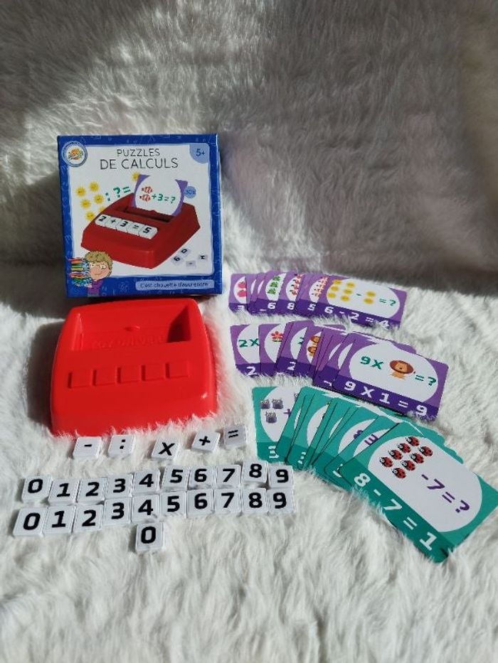 Ce coffret permet aux enfants d’apprendre le calcul tout en s’amusant! Les cartes représentent des additions avec des dessins et des chiffres. L’enfant doit alors reconstituer cette addition avec les carrés où sont indiqués les chiffres. Ce coffret contient : 1 support + 30 cartes recto-verso + 26 carrés. Jeu complet et en parfait état