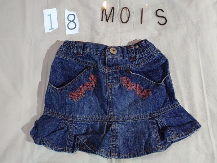 jupe en jean avec décoration rouge sur les poches, très bon état, 18 mois, marque kidkanaï