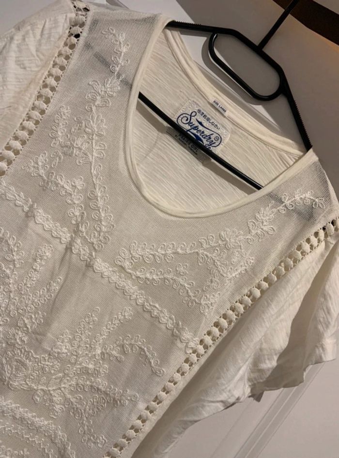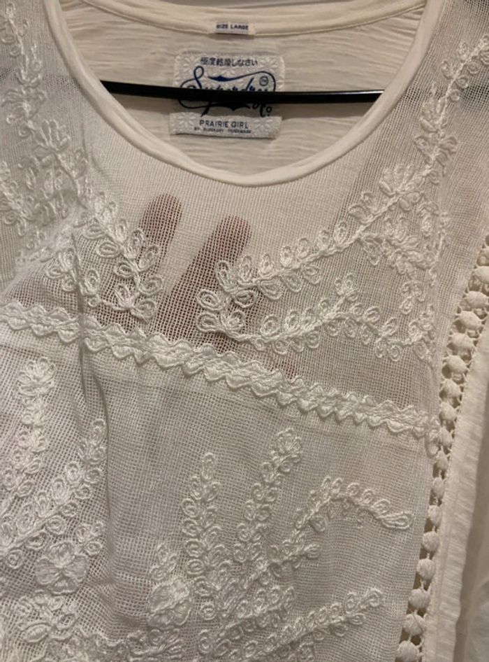 🔝 Haut t-shirt manches courtes Superdry blanc crème avec dentelle pompons et franges taille L 40 - photo numéro 3