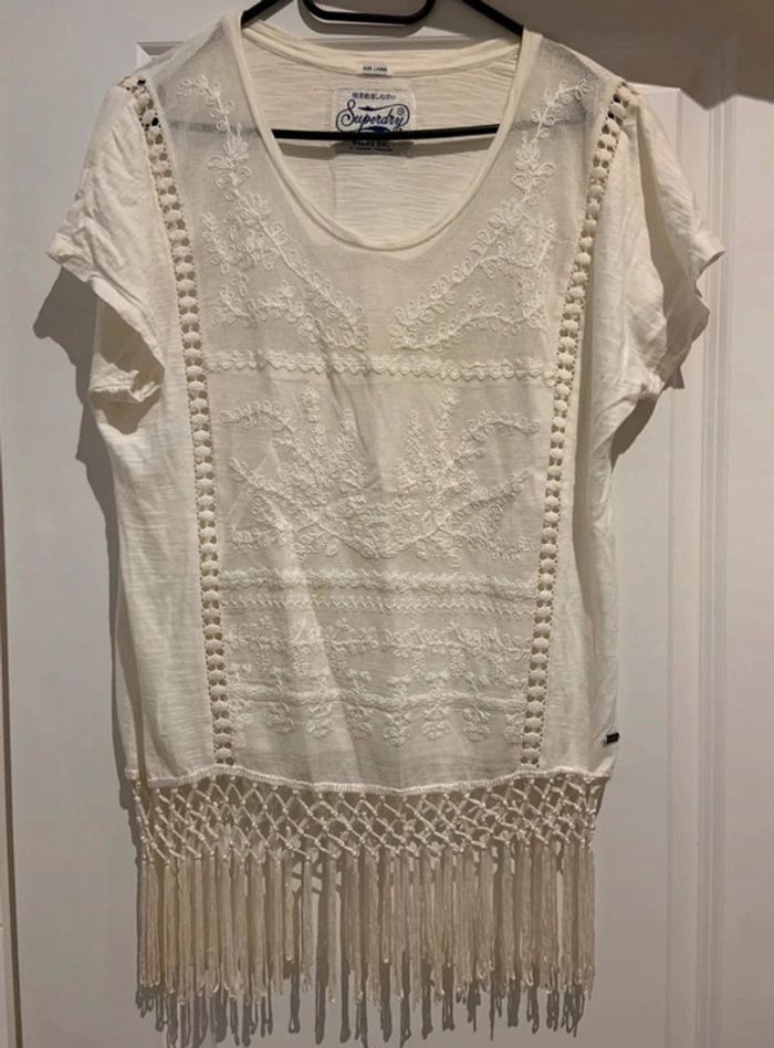 🔝 Haut t-shirt manches courtes Superdry blanc crème avec dentelle pompons et franges taille L 40 - photo numéro 1