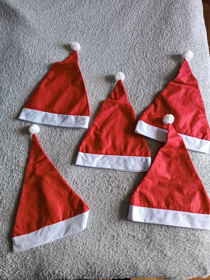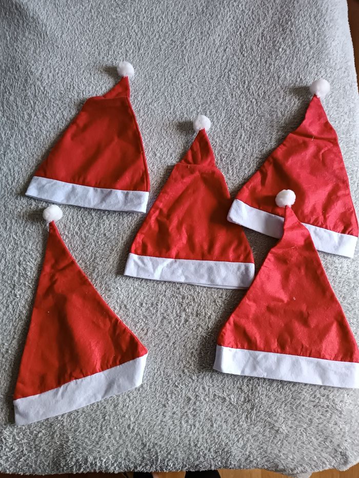 Lot composé de 5 bonnets de Père Noël, parfaits pour les fêtes, animations, photos, soirées de fin d’année ou école. Taille unique – légers et confortables. Très bon état ✔️ 👉 Envoi rapide 📦 👉 Dressing moderne & à petit prix ✨ 👉 Découvre aussi mes autres articles dans mon dressing