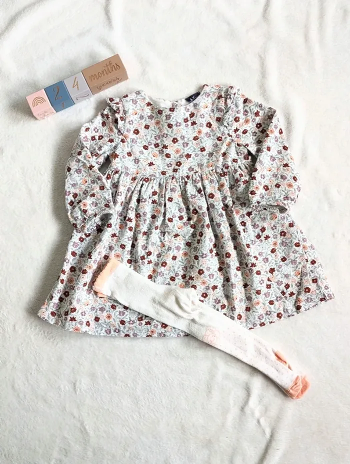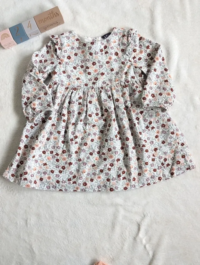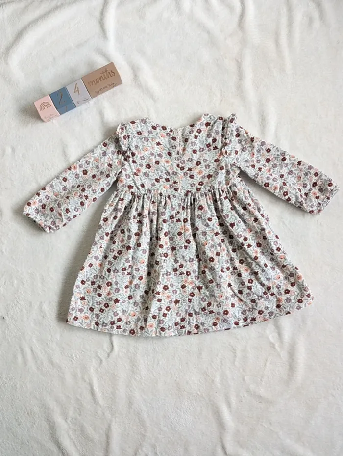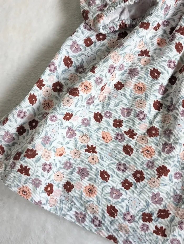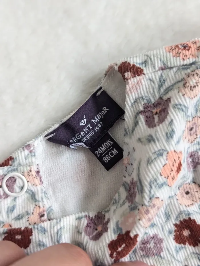- Robe en velours côtelé avec motif fleurie. Elle a des boutons pressions sur toute la longueur à l'arrière.