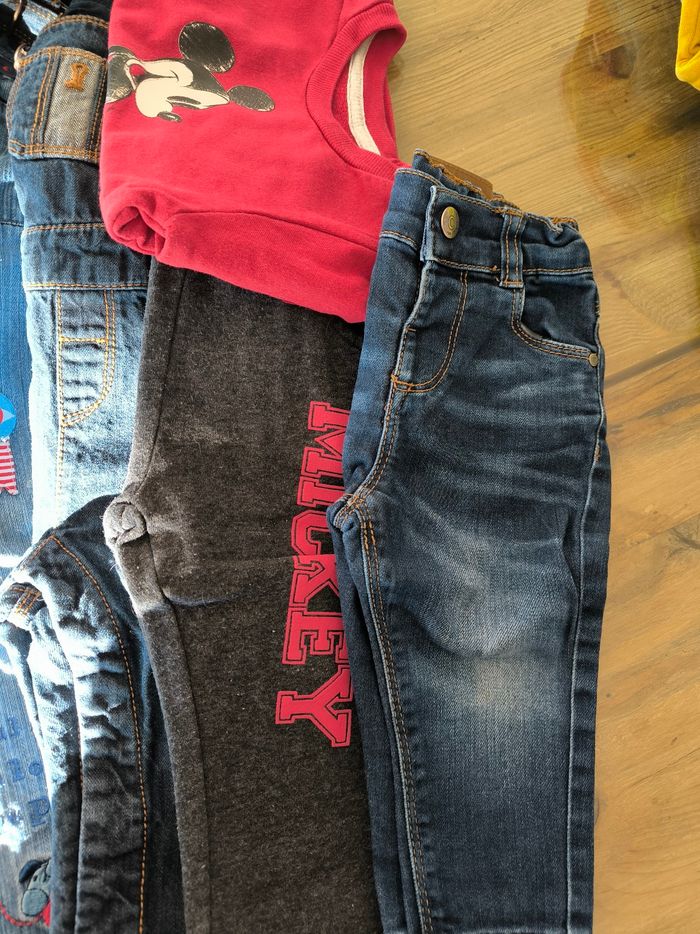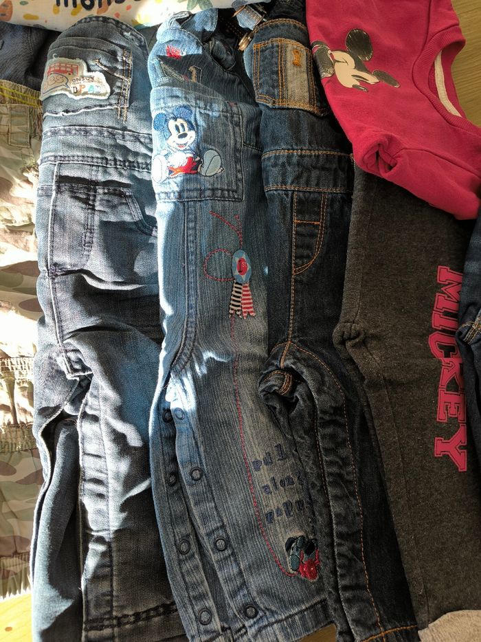 Lot vêtements 12 mois divers marques 4 pantalons 3 salopettes 1 chemise 1 pull 1 ensemble Mickey