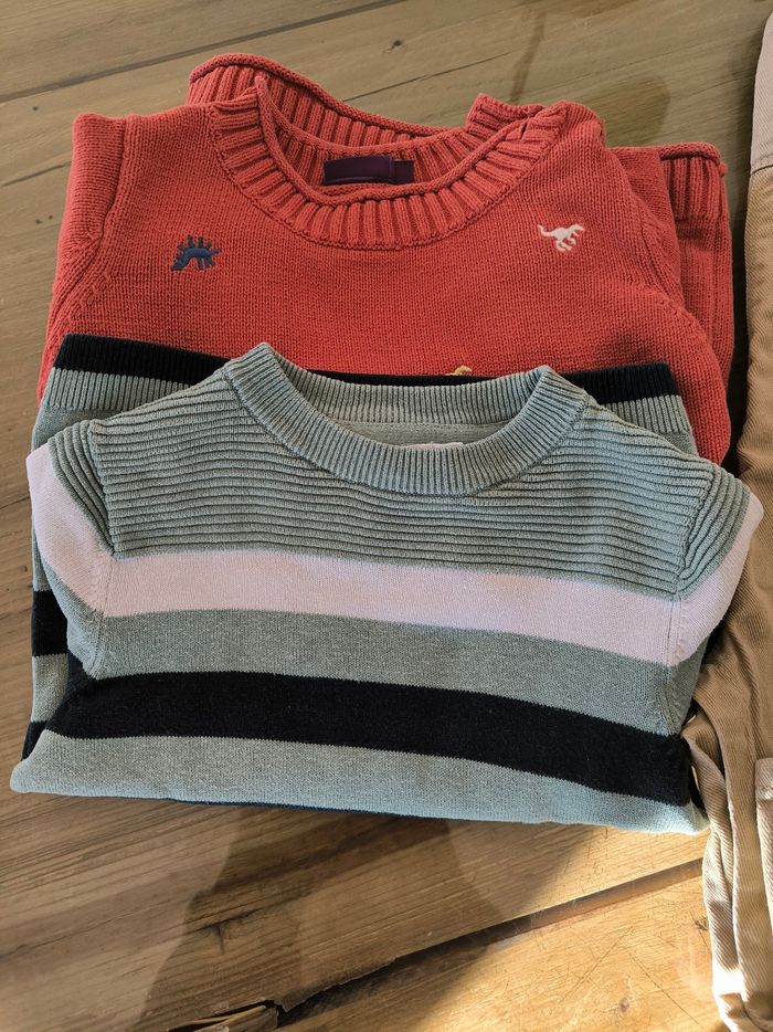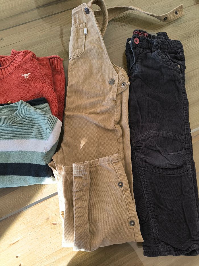 1 pantalon velours noir 1 salopette, pressions entre jambes et possibilité d'ajouter longeur jambes 2 pulls