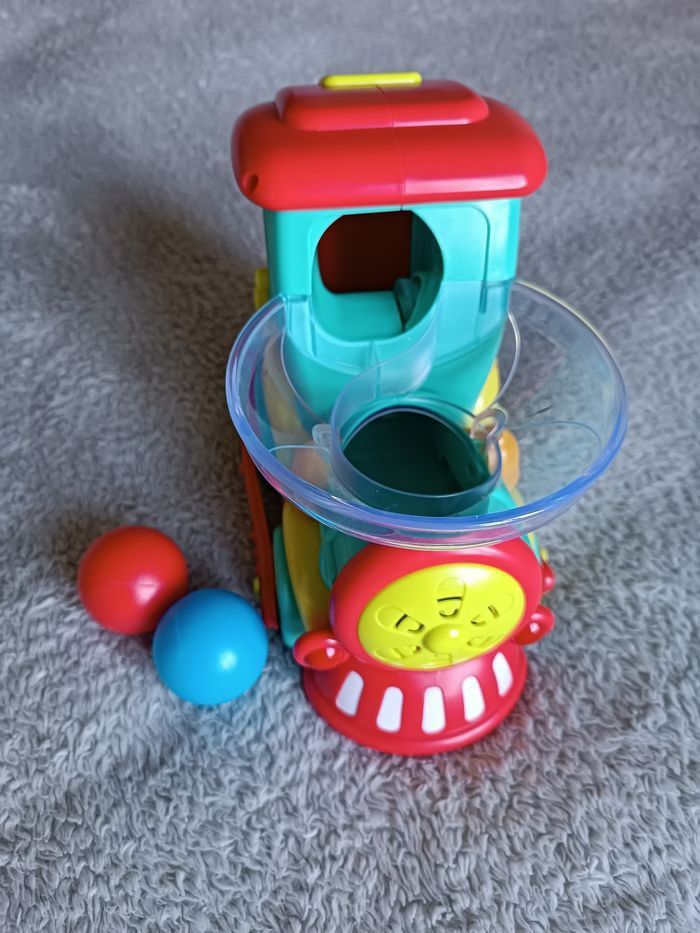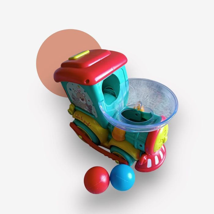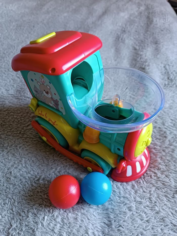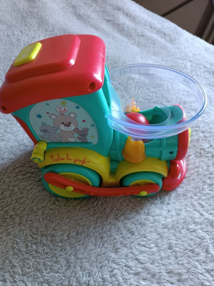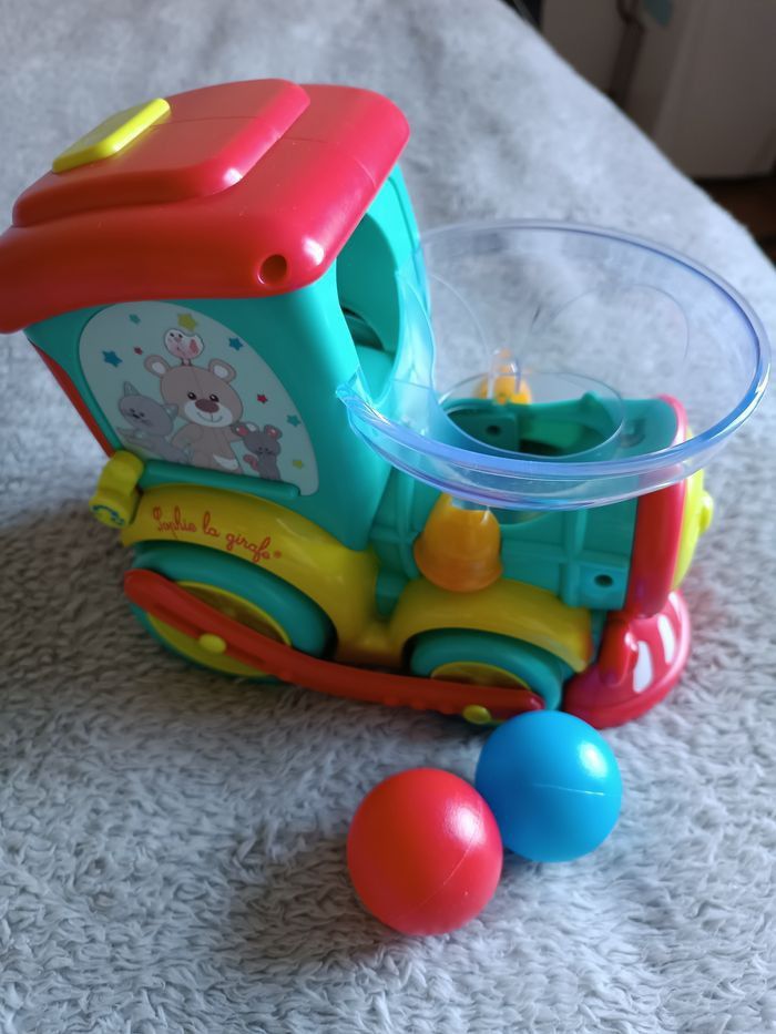 Jouet d’éveil coloré en forme de train interactif 🚂 avec balles incluses. Magik Pop train Sophie la girafe Idéal pour développer la motricité et la coordination des tout-petits L’enfant insère les balles, observe leur parcours et joue en s’amusant 🎉 multi-fonction Lumineux et musical Couleurs vives et ludiques, parfait pour stimuler la curiosité 👉 Très bon état, une légère trace dans le silo 👉 Convient dès 10mois En super état ( une trace dans le silo voir photo) À partir de 10 mois Fonction Auto Off (veille auto) Fonctionne à quatre piles AA Voir mes autres jouets
