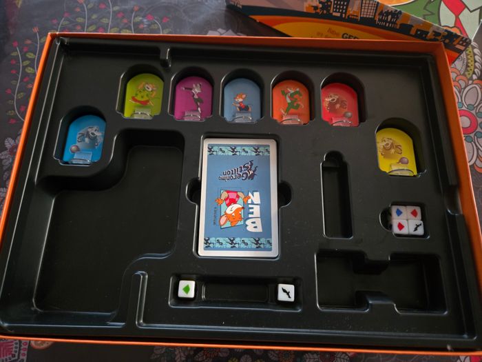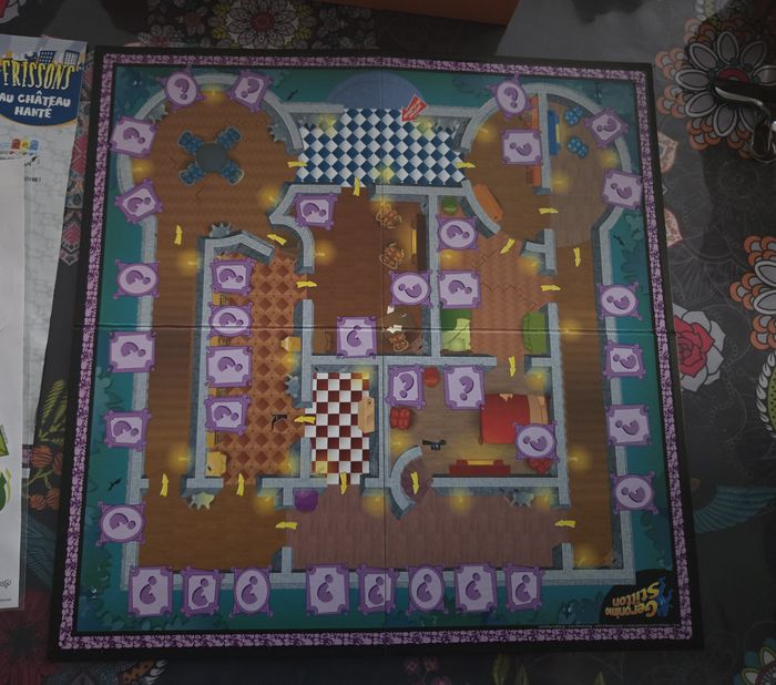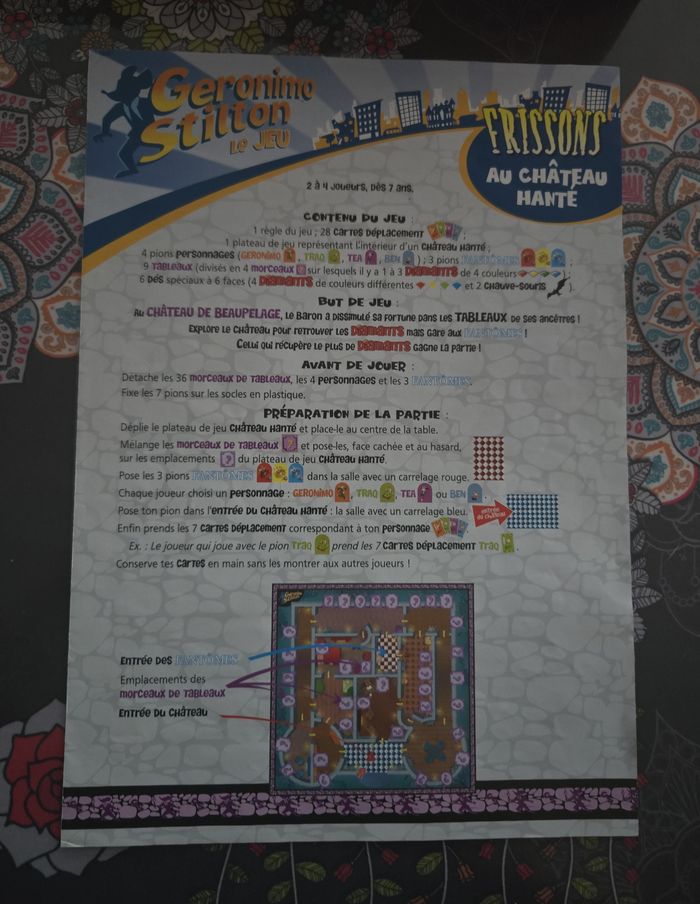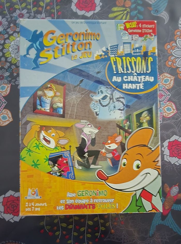 Jeu de société Asmodée Geronimo Stilton : Frissons au Château Hanté Avec les deux jeux de plateau Géronimo Stilton, les enfants vont vivre de fabuleuses aventures en compagnie de leur souris préférée et de tous ses amis ! Frissons au château hanté invite les détectives en culottes courtes à retrouver des diamants dissimulés dans des tableaux. Pour y parvenir, ils devront parcourir les salles du château et se méfi er des fantômes qui essaieront de dérober leurs pierres précieuses ! Un plateau de jeu ; 4 pions personnages ; 3 pions fantômes ; 9 tableaux ; 6 dés spéciaux ; 28 cartes ; 2 chauve-souris (manquantes) ; 1 livret de règles. 2-4 joueurs Il manque juste les 2 petites chauve souris en plastique en très bon état ⚠️ Les envois se font uniquement via mondial relais, shop2shop by chronopost ou colissimo N'hésitez pas a me contacter pour plus d'infos supplémentaires Merci