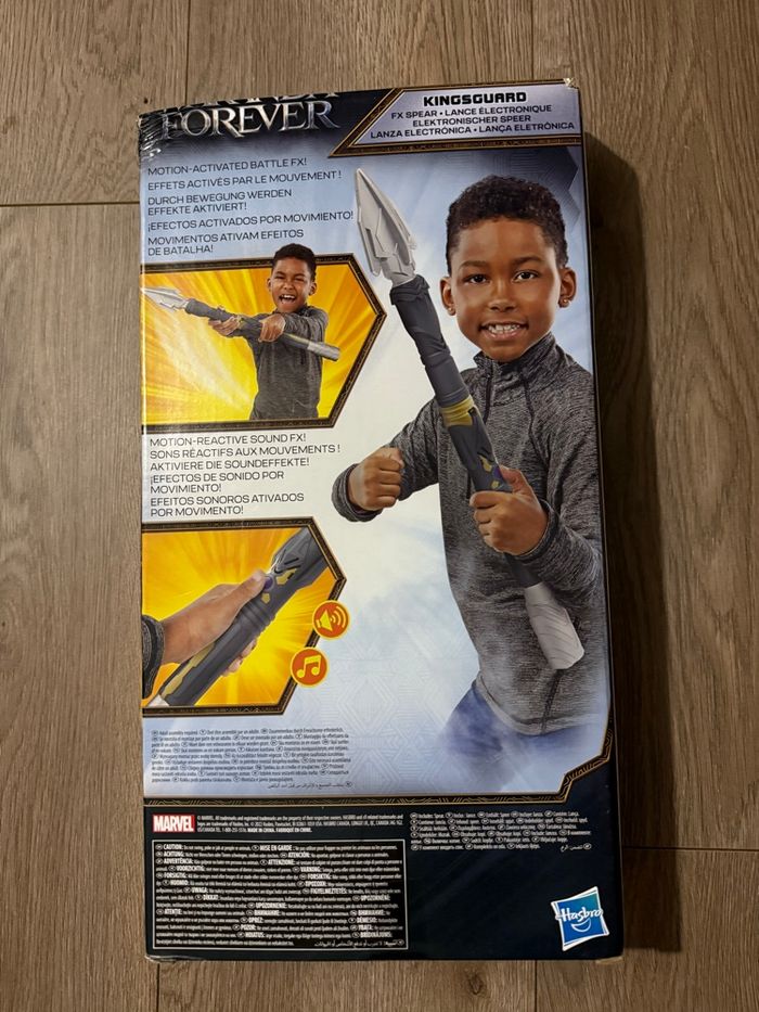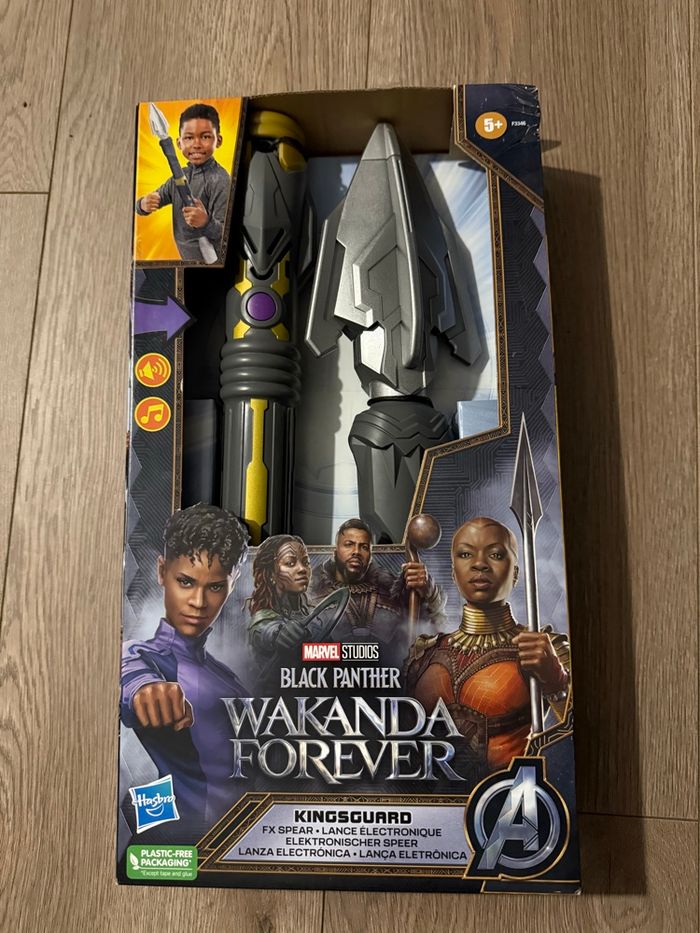 Défendez le pays de Wakanda avec une arme pas comme les autres ! Ramenez à la maison cette lance électronique Black Panther Wakanda Forever Kingsguard de Hasbro ! Obtenez cette grande lance avec des effets sonores qui sont activés par des mouvements et en appuyant sur le bouton. Assemblez la lance en deux parties et passez à l'action comme un vrai guerrier wakandais, le cadeau idéal pour les fans de Black Panther et des Avengers. Obtenez ceci et tous les nouveaux jouets du nouveau film Black Panther Wakanda Forever ! Recréez vos moments d'action préférés avec l'une des armes les plus incroyables !