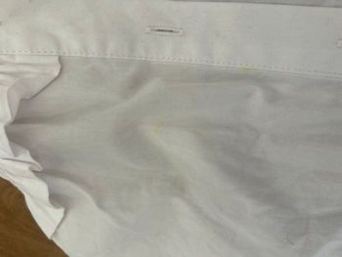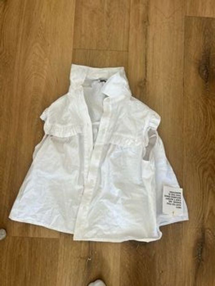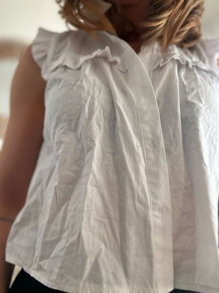 La petite chemise est très belle avec étiquette Elle a juste des détails (voir photo) petites taches jaunes sur le devant mais pas voyant 🌞