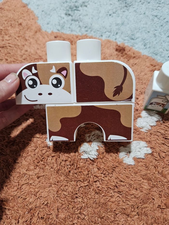 Comprends le tracteur, la vache le pot de lait, la porte et le buisson