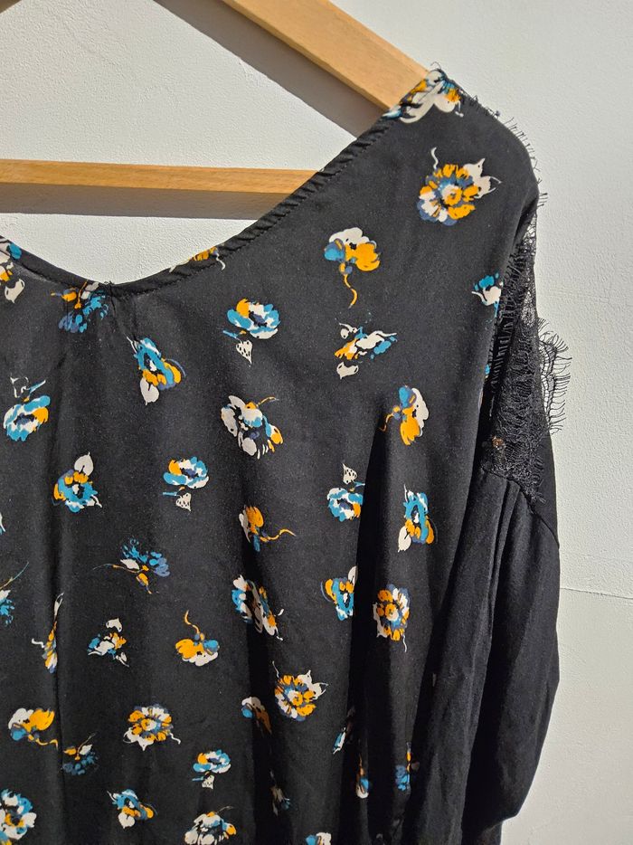🌼 Haut noir fleuri – Taille 48 Joli haut noir à motifs fleuris (bleu, jaune et blanc), coupe fluide et confortable. Détails en dentelle au niveau des manches et du bas pour un style féminin et élégant. Tissu léger, parfait pour la mi-saison ou l’été. 🖤 État : Bon état 📏 Taille : 48