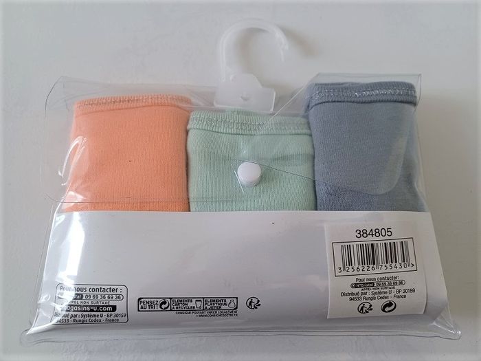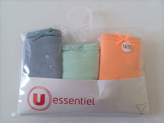 Lot de 3 culottes fille marque U Essentiel âge 14/16 ans couleur gris / vert / orange neuves dans leur emballage. Matière : 100% coton. Plusieurs quantités disponibles.