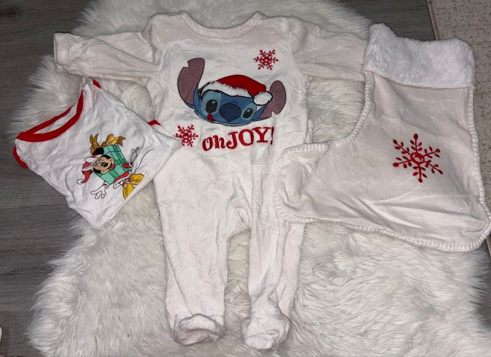 Lot comprenant un pyjama stitch tout doux NOËL + 1 chaussette rangement + 1 Bodie 3 mois Très bon état ☺️ Article mis en vente sur d’autres plateformes Premier arrivé, premier servi