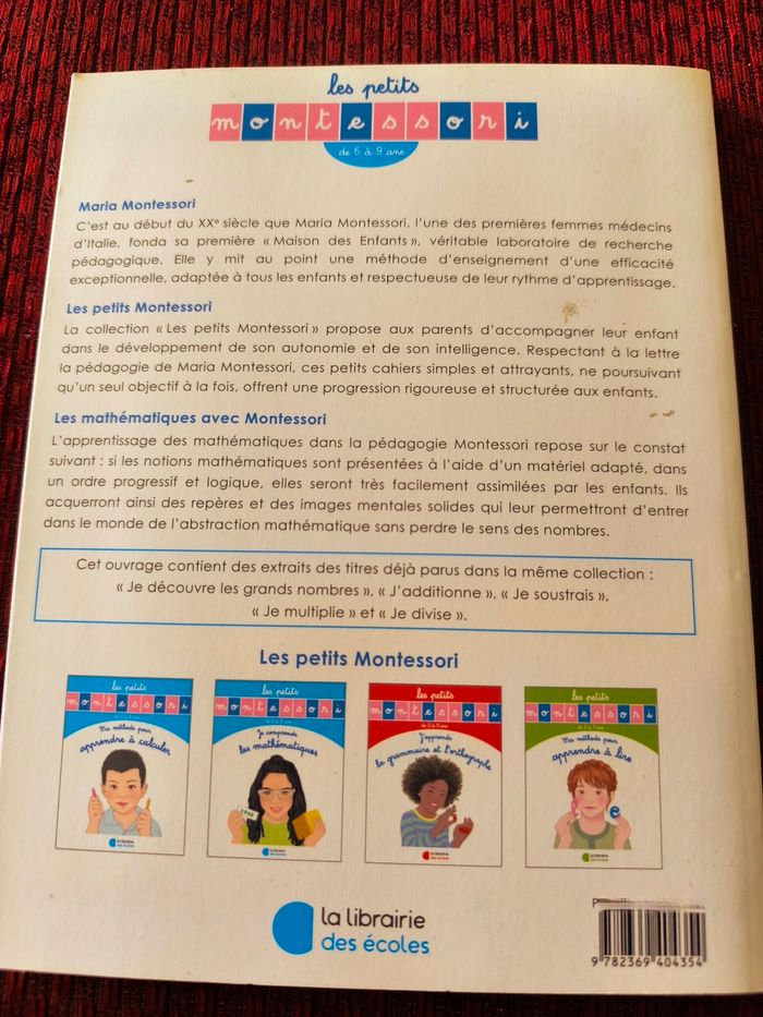 Maria Montessori : C'est au dbut du XXe sicle que Maria Montessori, l'une des premires femmes mdecins d'Italie, fonda sa premire " Maison des Enfants", vritable laboratoire de recherche pdagogique. Elle y mit au point une mthode d'enseignement d'une efficacit exceptionnelle, adapte tous les enfants et respectueuse de leur rythme d'apprentissage. Les petits Montessori : La collection "Les petits Montessori" propose aux parents d'accompagner leur enfant dans le dveloppement de son autonomie et de son intelligence. Respectant la lettre la pdagogie de Maria Montessori, ces petits cahiers simples et attrayants, ne poursuivant qu'un seul objectif la fois, offrent une progression rigoureuse et structure aux enfants. Les mathmatiques avec Montessori : L'apprentissage des mathmatiques dans la pdagogie Montessori repose sur le constat suivant : si les notions mathmatiques sont prsentes l'aide d'un matriel adapt, dans un ordre progressif et logique, elles seront trs facilement assimiles par les enfants. Ils acquerront ainsi des repres et des images mentales solides qui leur permettront d'entrer dans le monde de l'abstraction mathmatique sans perdre le sens des nombres.