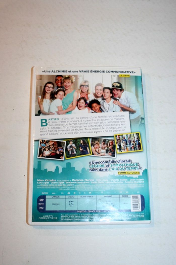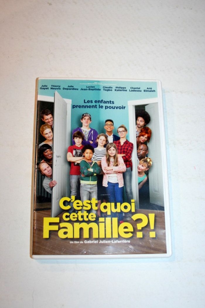 DVD C'est quoi cette famille?! de Gabriel Julien-Laferrière, avec Julie Gayet, Thierry Neuvic, Julie Depardieu, dvd un peu griffé mais passe parfaitement car visionné avant la mise en vente, 80g Bastien, 13 ans, est au centre d’une famille recomposée : 6 demi-frères et soeurs, 8 « parents » et autant de maisons. Son emploi du temps familial est bien plus complexe que celui du collège... Trop c’est trop : les enfants décident de faire leur révolution et inversent les règles. Tous ensemble, ils squattent un grand appart’, et ce sera désormais aux parents de se déplacer !