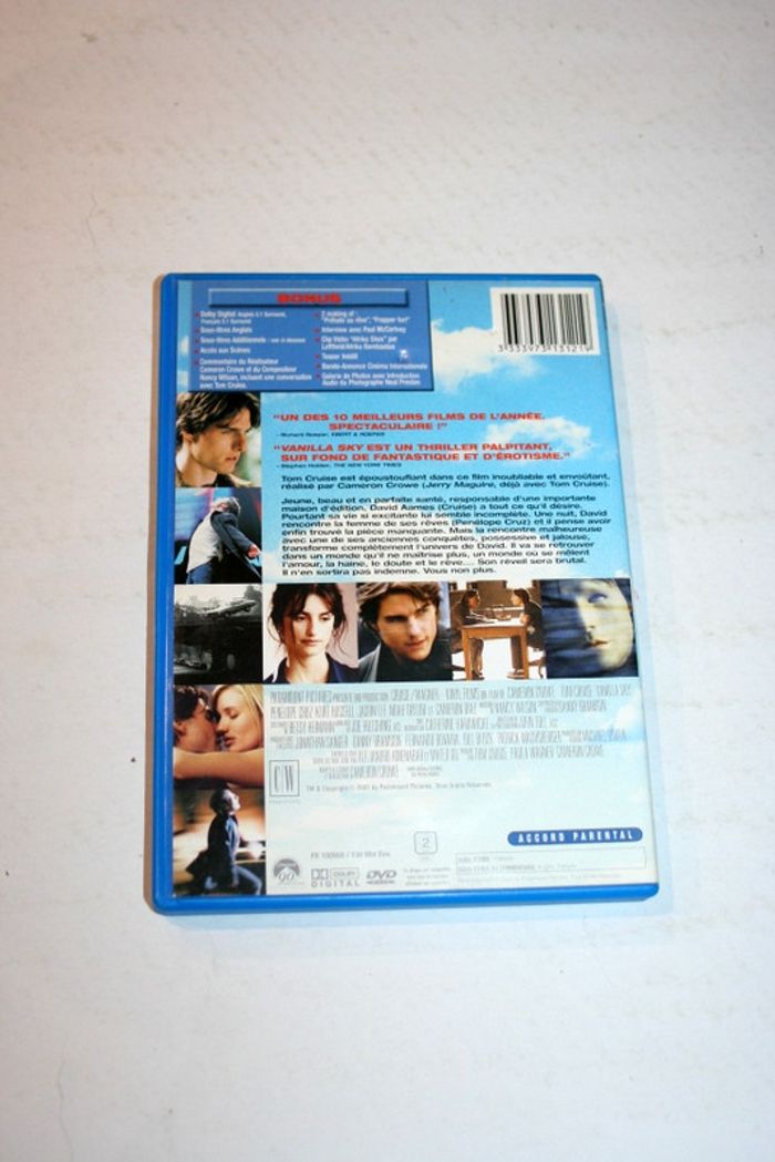 DVD Vanilla Sky de Cameron Crowe, avec Tom Cruise, Penélope Cruz, Kurt Russell, dvd un peu griffé mais passe parfaitement car visionné avant la mise en vente, 130g David Aames est un jeune et brillant éditeur new-yorkais qui a tout pour lui : l'argent, la réussite professionnelle et les femmes. Son ami Pelayo commet l'erreur de lui présenter Sofia, sa nouvelle compagne. Au premier regard, David succombe au charme de celle-ci. Tous les deux filent bientôt le parfait amour. Alors que David se dispute en voiture avec Julie, une ex folle de jalousie, la jeune femme accélère et c'est l'accident. Julie décède. Atrocement défiguré, David est transporté d'urgence à l'hôpital où les médecins ne peuvent réaliser de miracle. Sa vie bascule. Les gens ont dorénavant peur de lui et Sofia l'évite. Mais un matin, David se fait gentiment réveiller par celle-ci, qui lui déclare son amour. Les médecins lui annoncent même qu'il pourra retrouver son ancien visage. Réalité ou hallucination ?