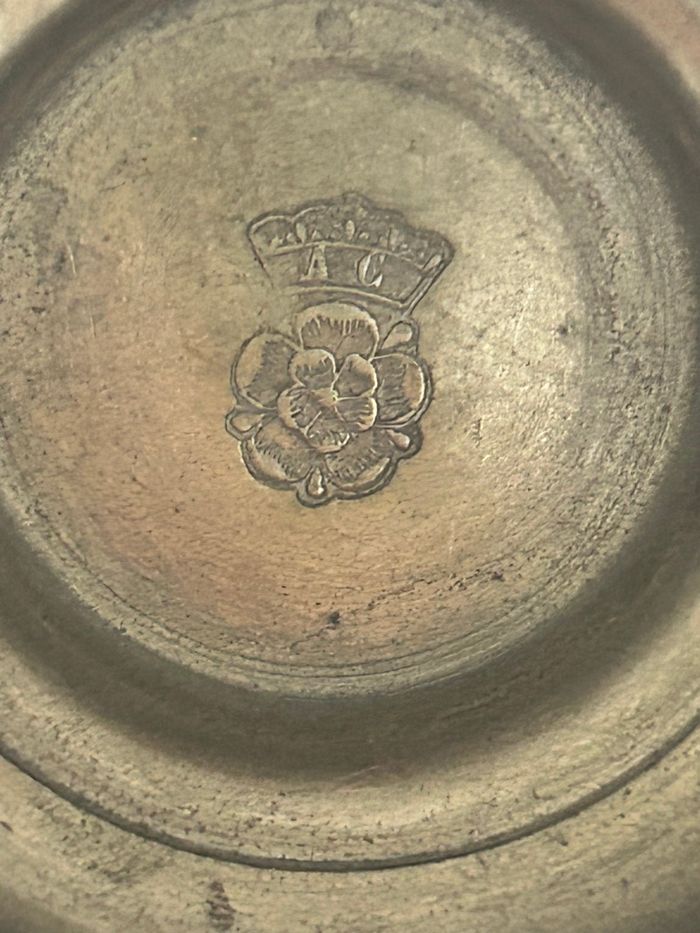 Mesurant 9 cm de hauteur, 6 cm de circonférence, ( poinçon ; couronne A C ) objet légèrement plier sur le dessus idéale pour collectionneur ou pour une pièce de théâtre car cette timbale peut éventuellement servir de calice , graal ….chevalier de ma table ronde , Etc…..