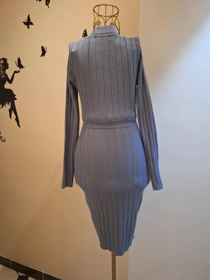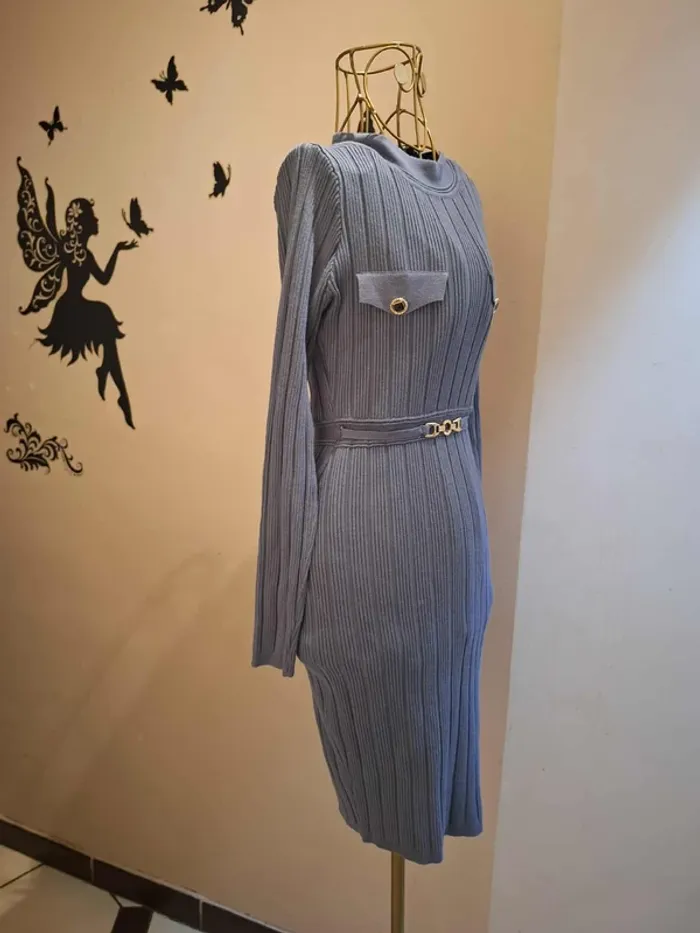 Robe pull entre le bleue clair et le gris - ceinture incorporée avec boucle or & strass - longueur 89 cm - coupe cintrée et moulante - taille unique idéale pour une taille S ou 36 - état sans défaut ps : je ne fais pas de photo portée #robepull #robepullbleugrise #robehiver